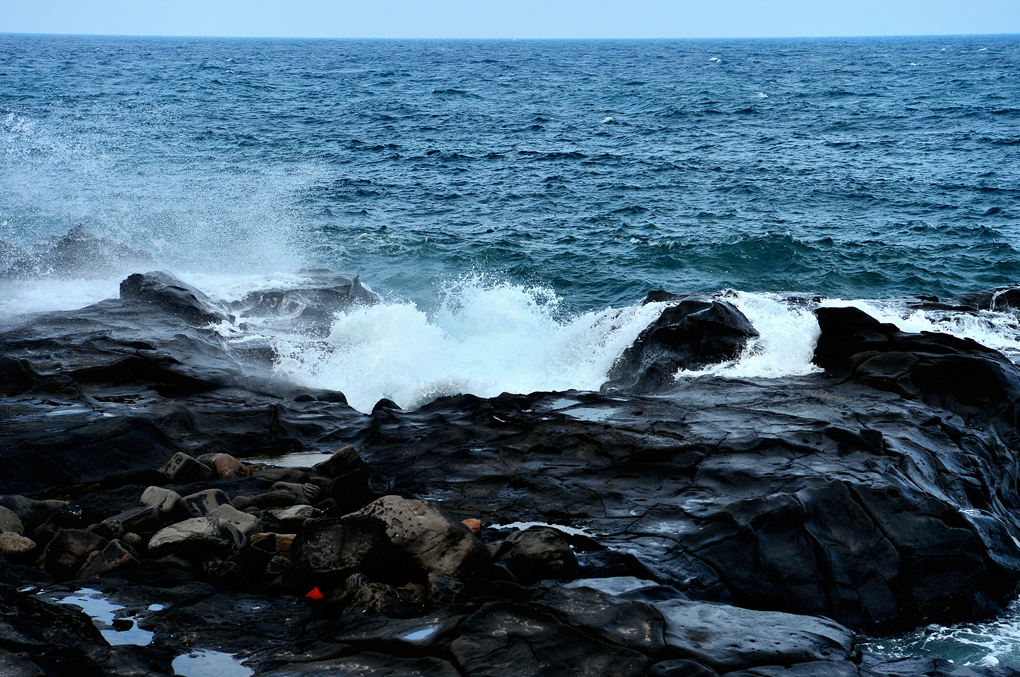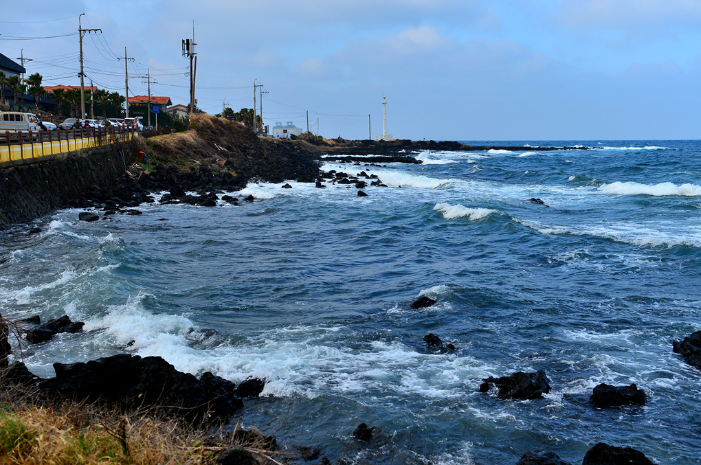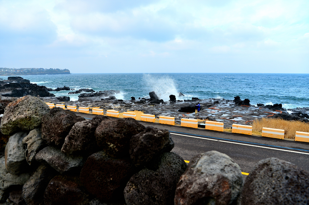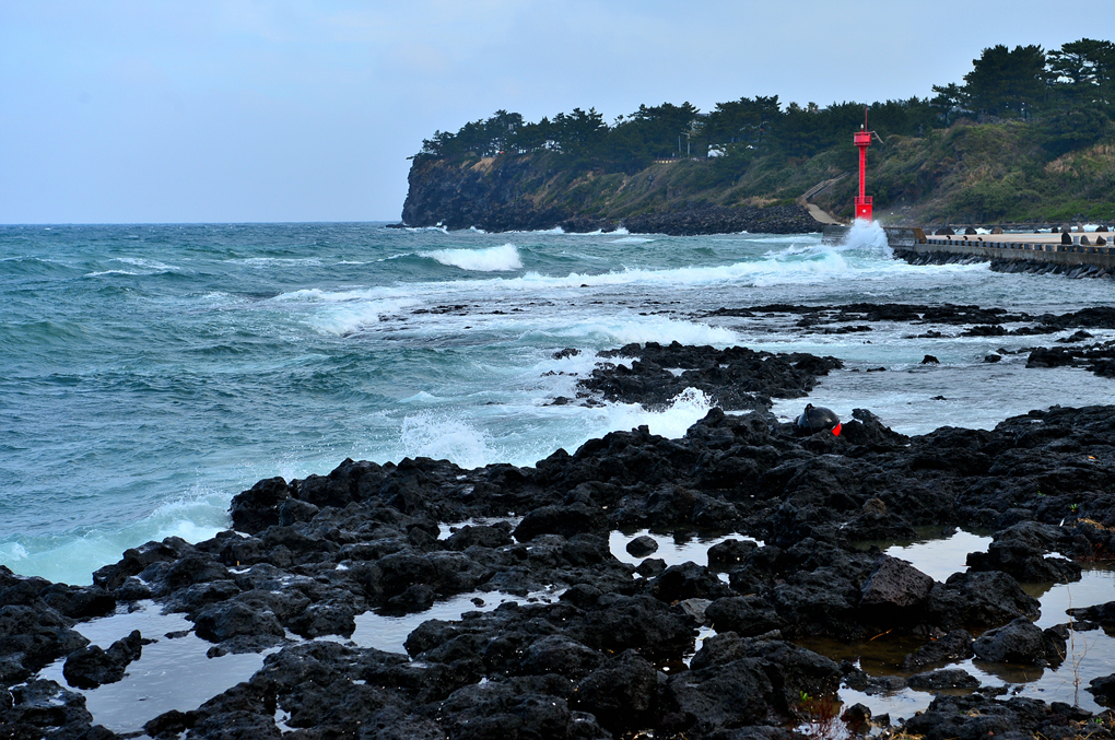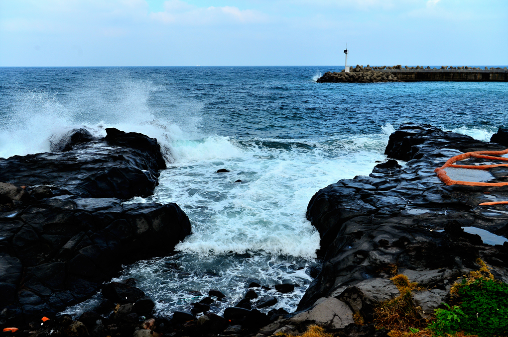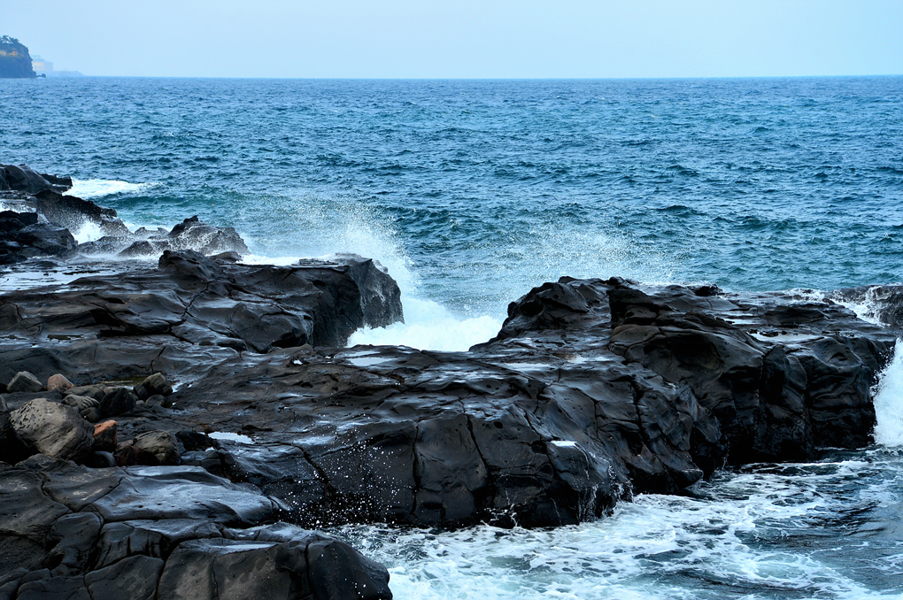 어제는 파도가 잠잠해서 바닷가 암석의 주상절리까지 볼 수 있었는데, 오늘은 거센 파도가 바위를 휩쓸고 있다.