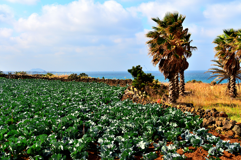 푸른 밭 너머로 드넓은 바다가 보인다.