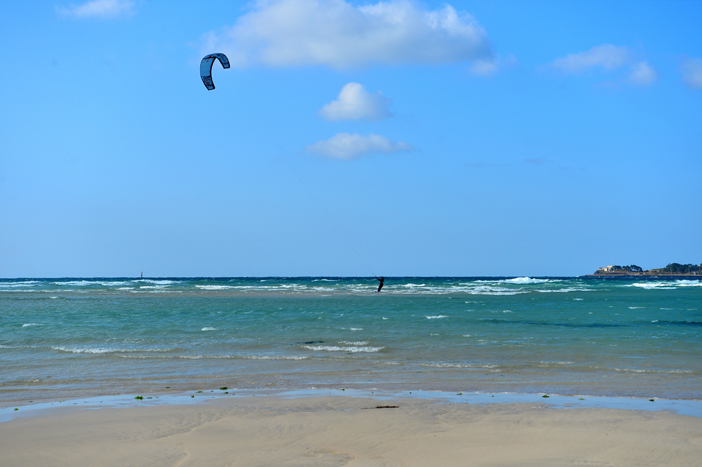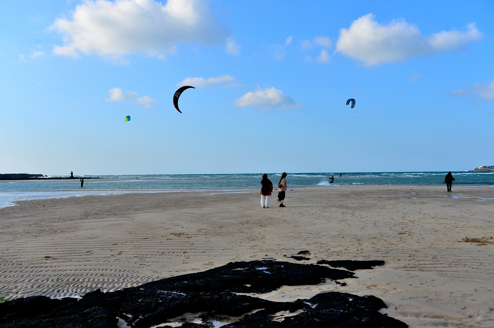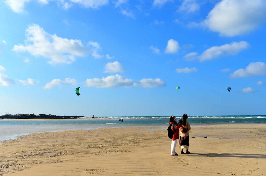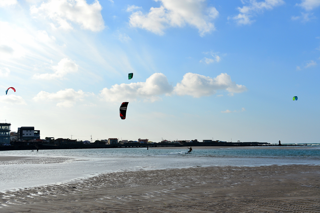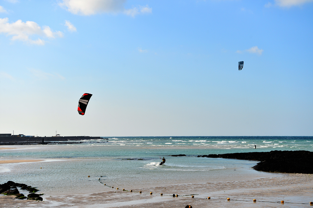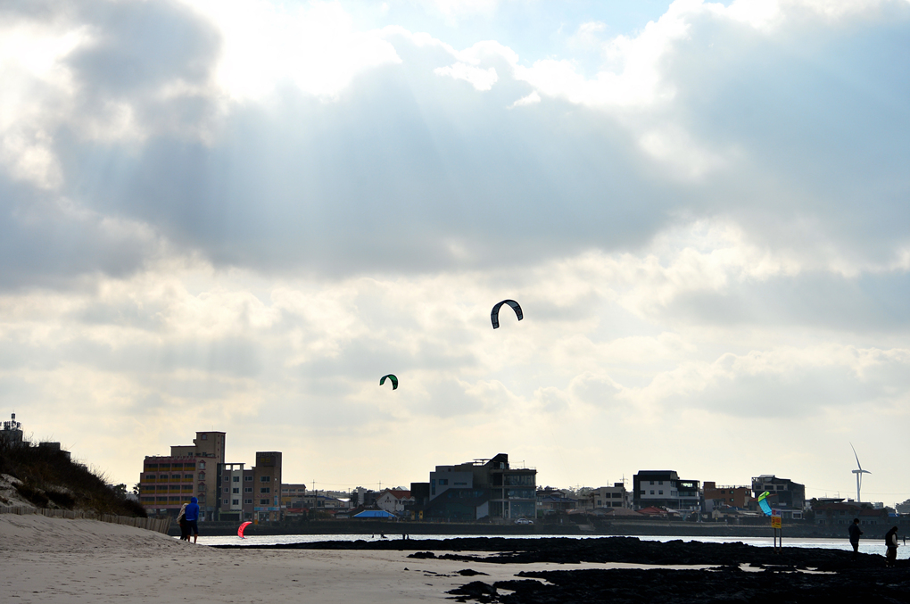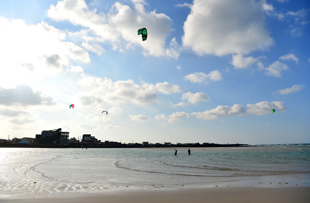 잠시 카이트 보더들의 멋진 서핑을 즐겨 본다.