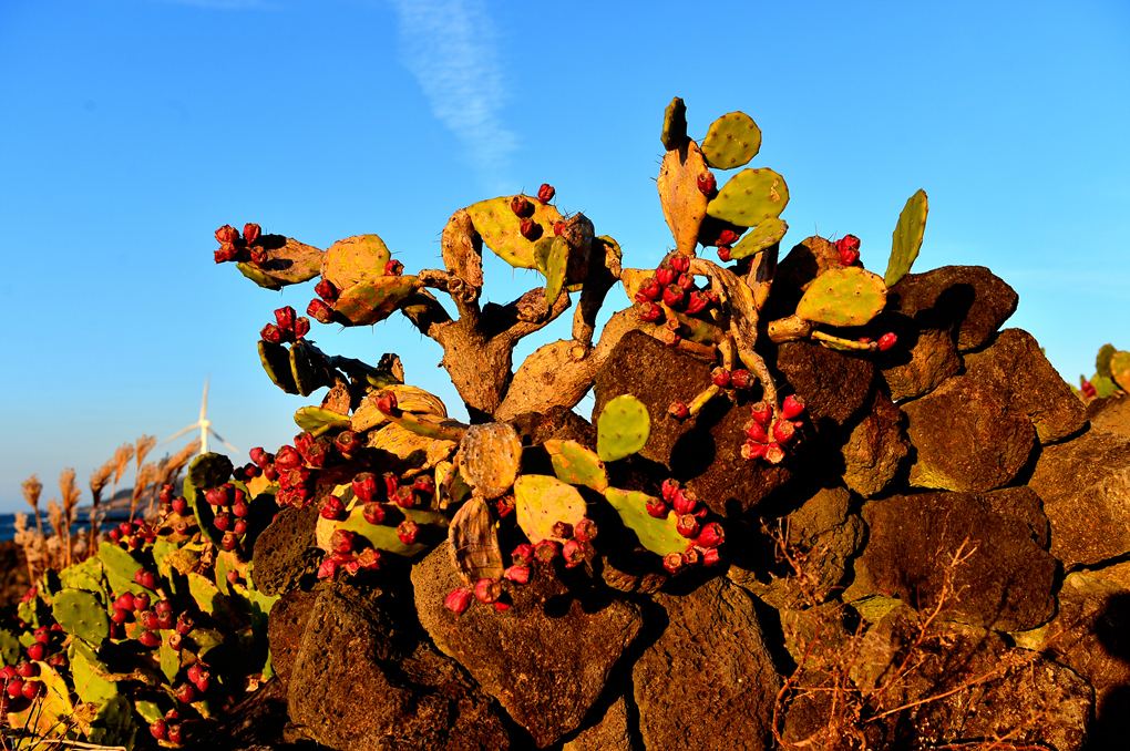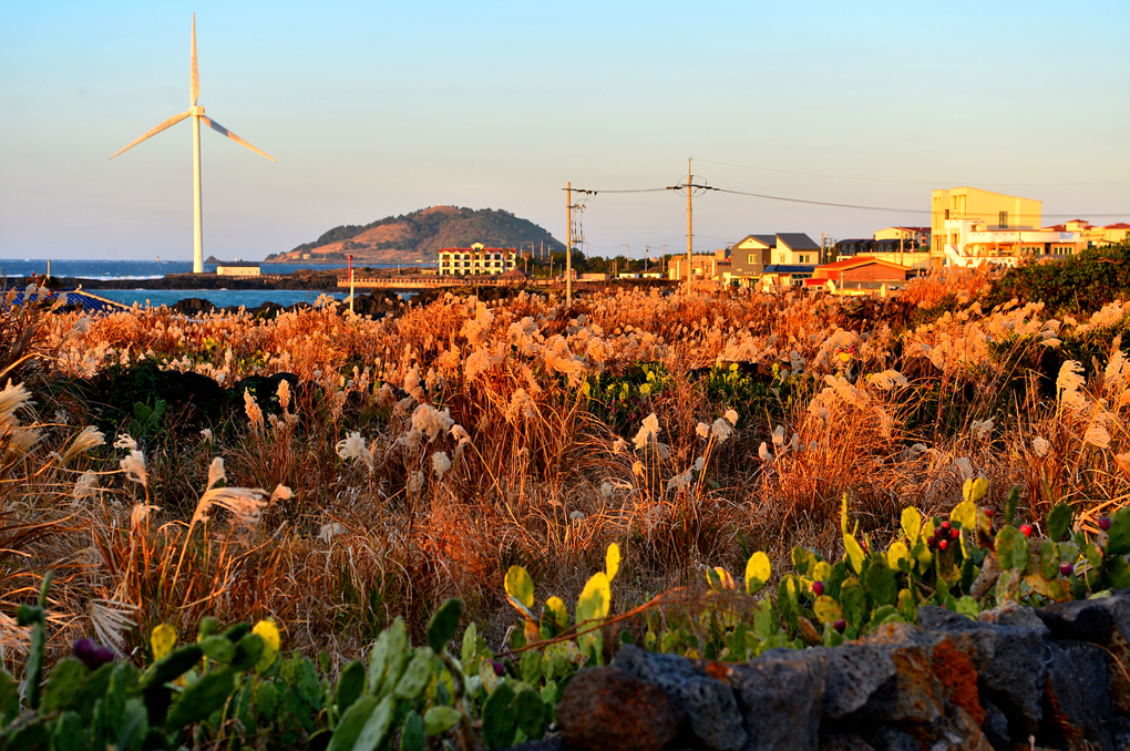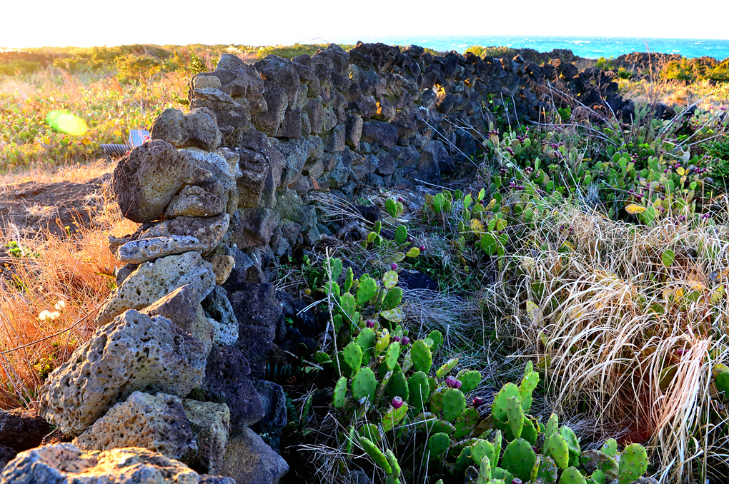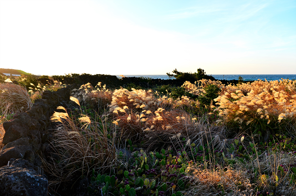 돌담과 선인장, 억새가 한데 어우러져 아름다운 풍경을 연출하고 있다.