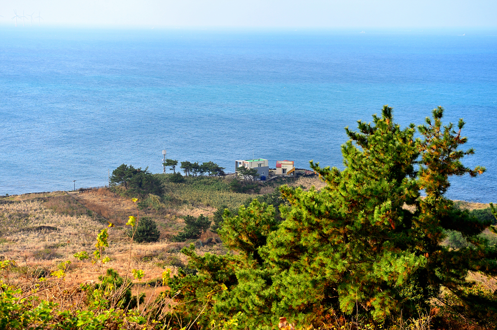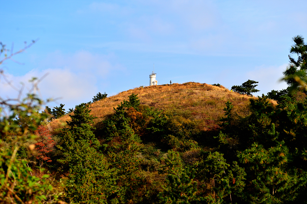 하산하면서 올려다본 오름 위의 등대 모습이다.