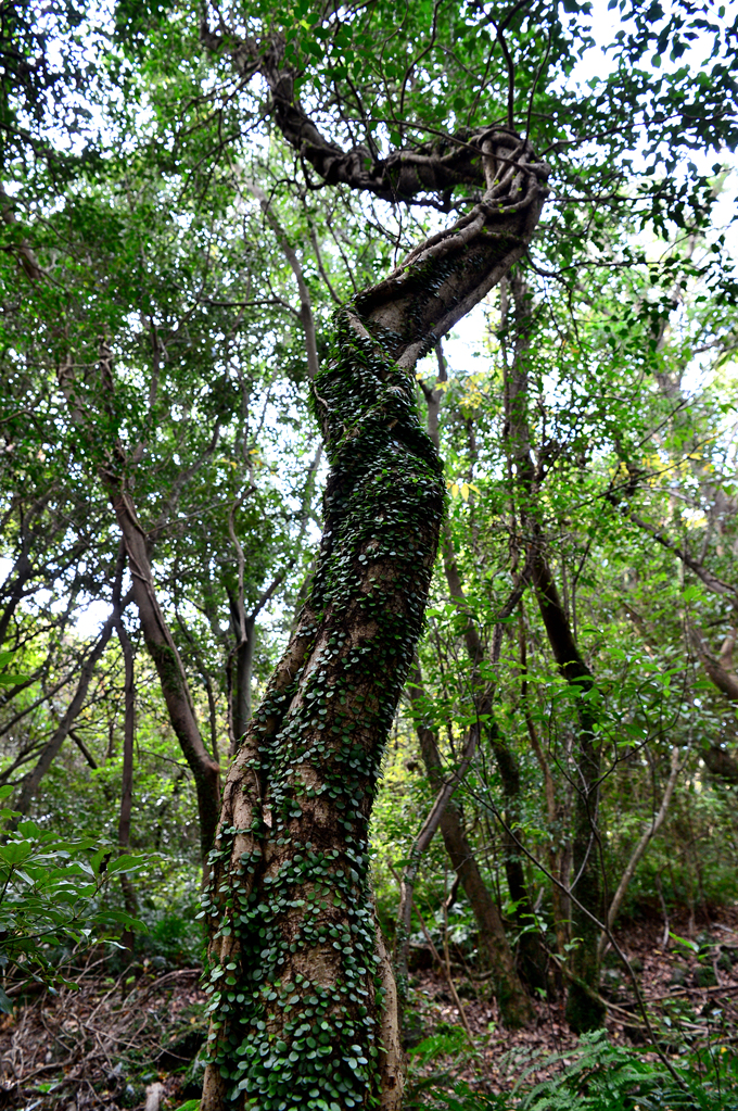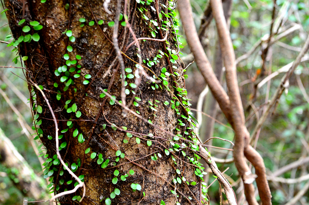 나무 등걸을 타고 오르는 덩굴 식물의 자그마한 잎들이 싱그럽게 다가온다.