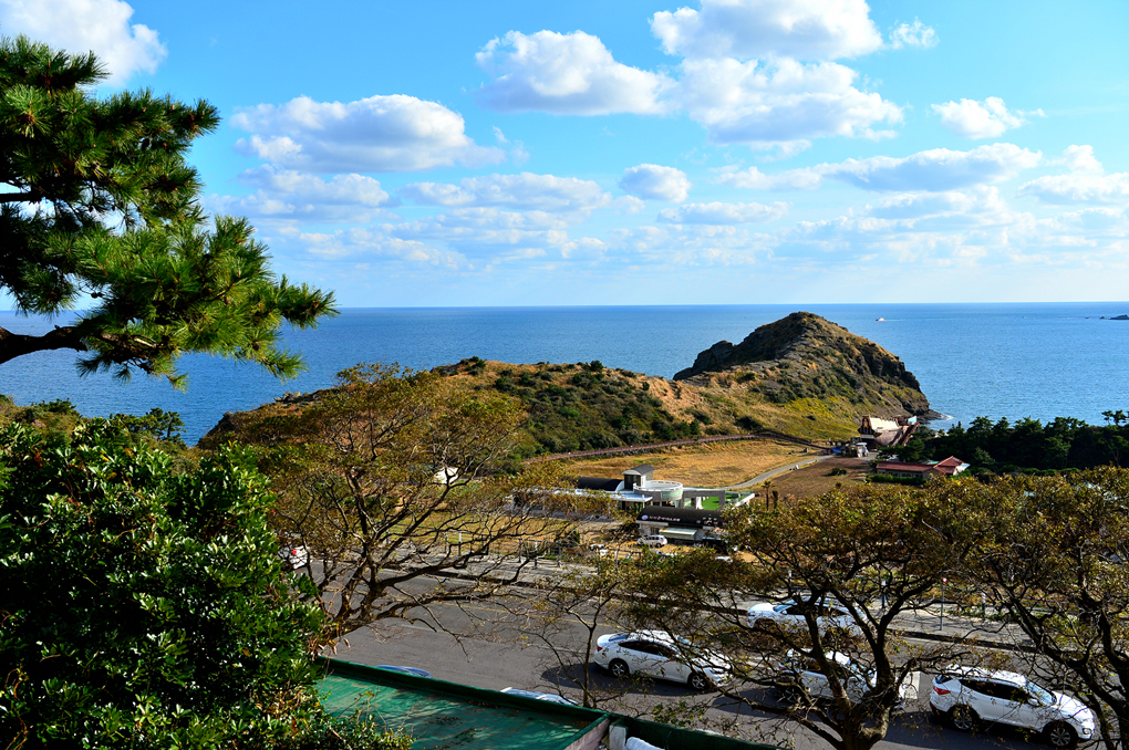 길을 오르면서 본 용머리 해안과 그 너머의 바다 풍경이다.