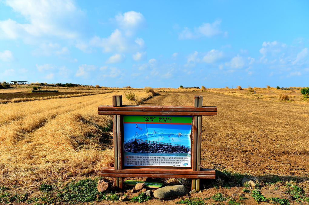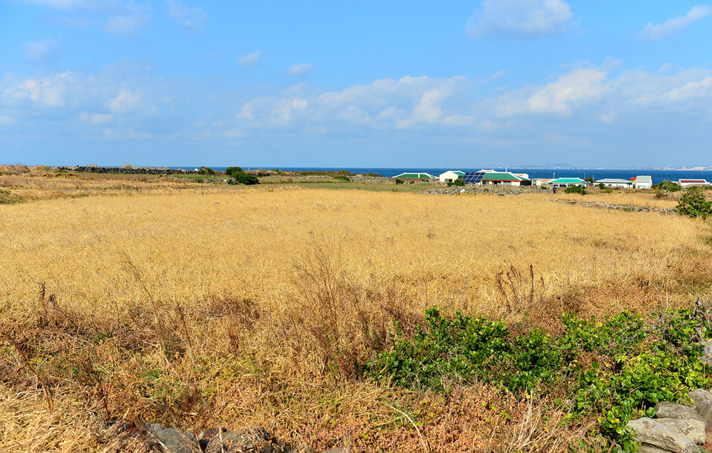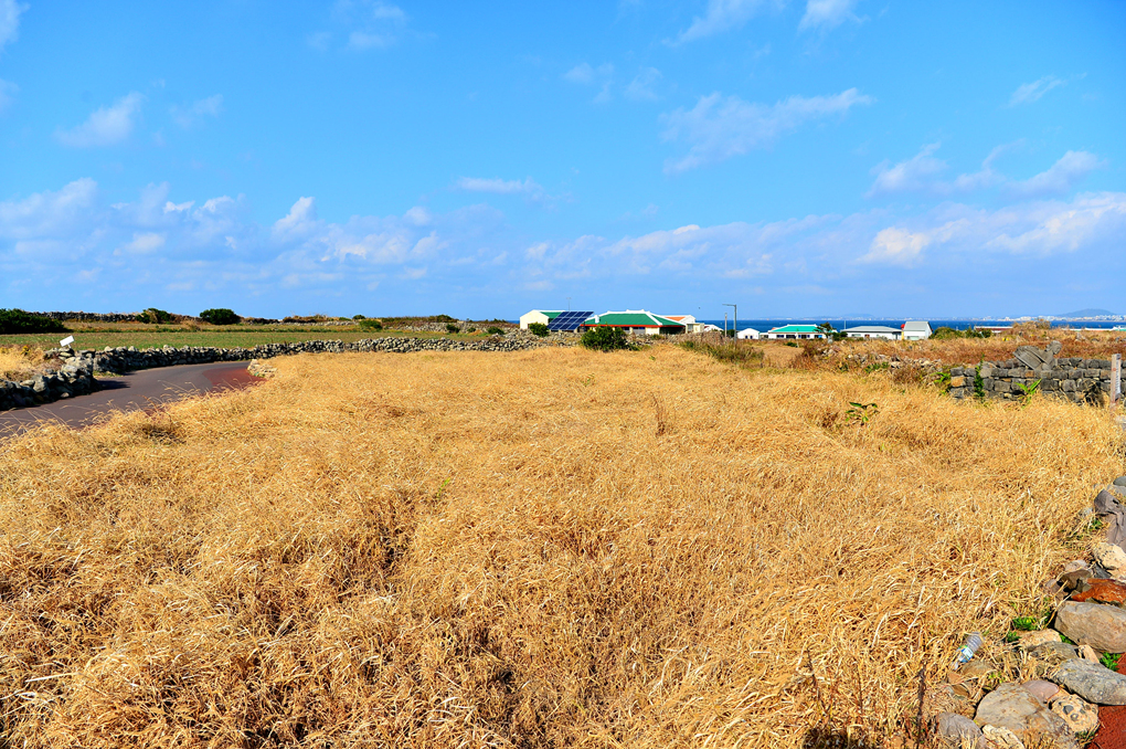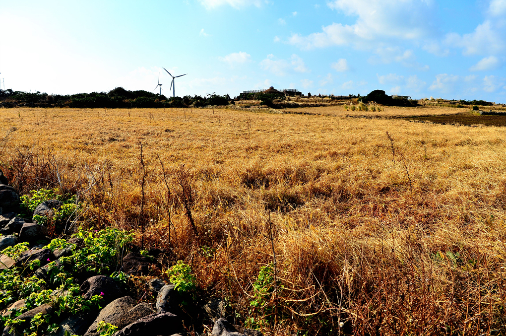 얕은 돌담과 함께 넓은 들판이 펼쳐져 있다.