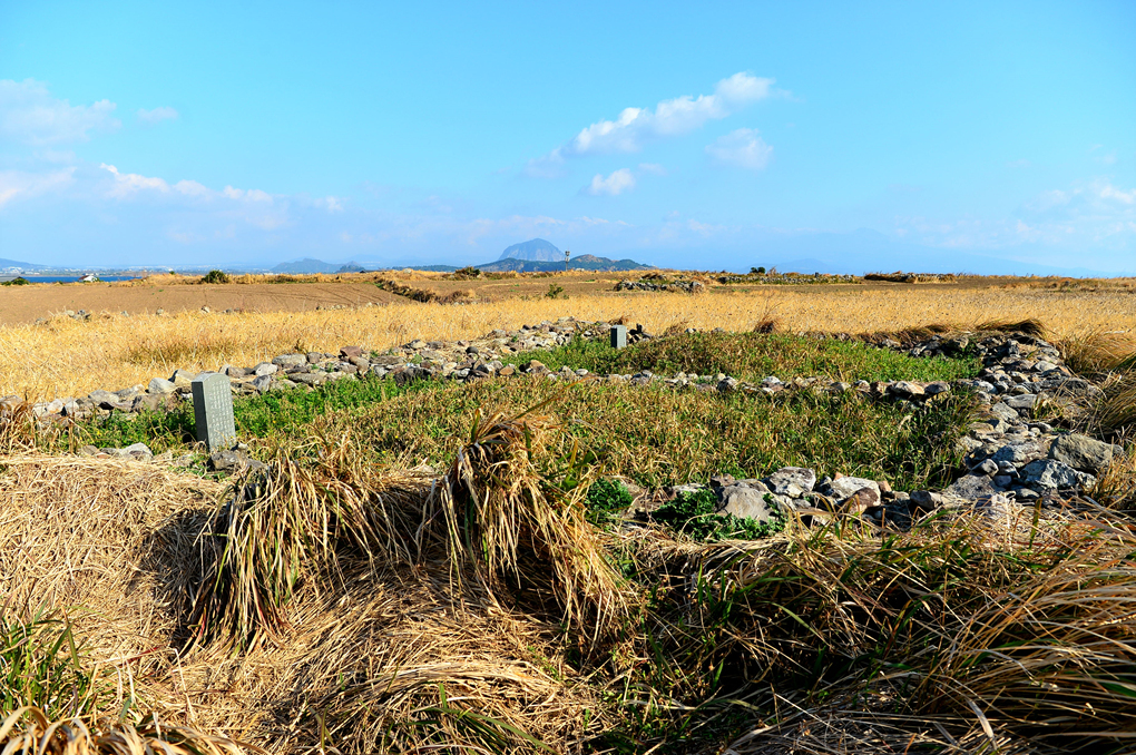 밭 가운데서 제주에서 흔히 볼 수 있는 죽은 이의 쉼터가 보인다.