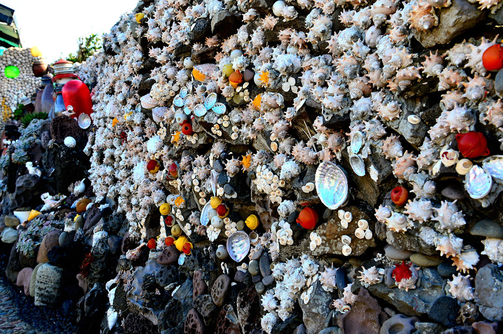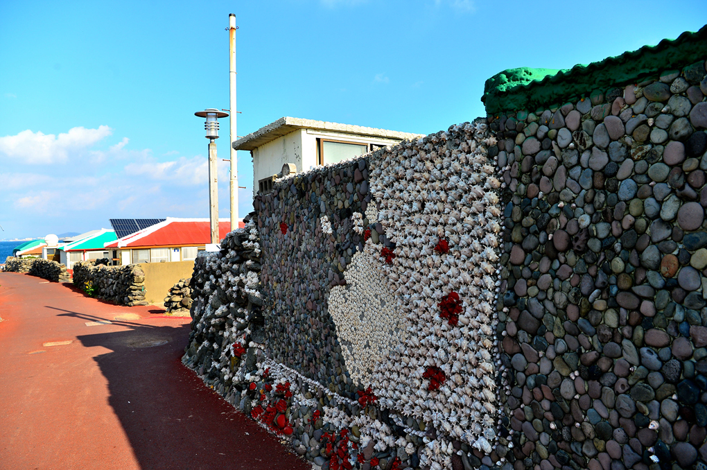 돌담에 붙어있는 각종 어패류의 껍질들이 현란한 예술품을 보는 듯하다.