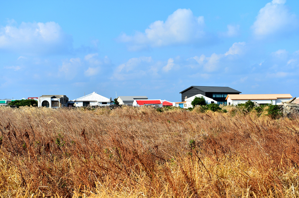 낮게 펼쳐져 있는 가파도의 들과 건물들 모습이다.