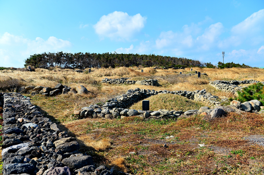작은 돌담에 둘러싸인 가파도의 묘지 풍경이 이채롭다.