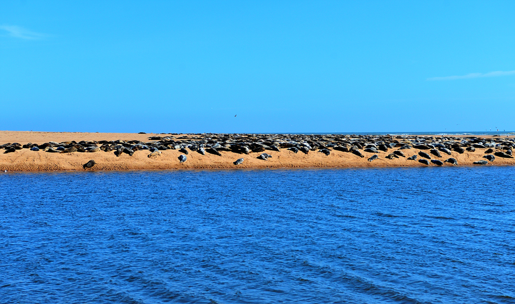 바닷물로 갈라진 해변 건너편의 모래톱에서 수많은 물개들이 평화롭게 휴식을 취하고 있는 모습이 보인다.