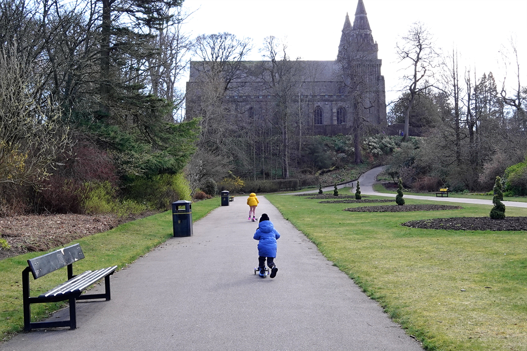 세인트 마카르 성당 뒤쪽의 시튼 파크와 연결되어 있는 Cathedral Walk에서 킥보드를 타고 있는 손주들 모습이다.
