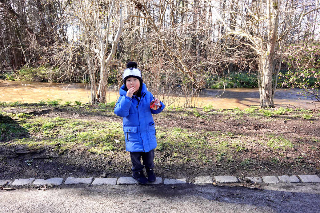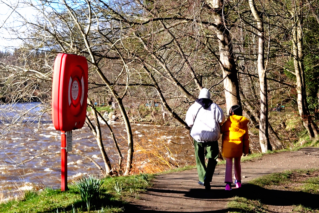 강이 인접해 있어 이곳은 위험한 듯 하니, 킥보드는 그만 타고 산책을 하자꾸나~
