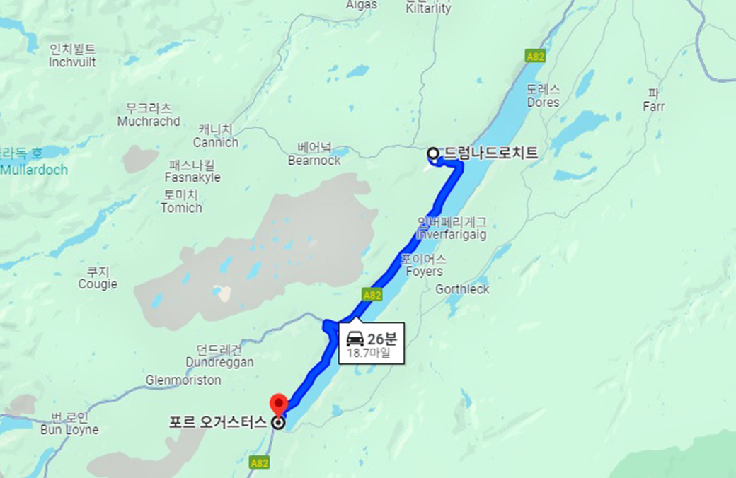 우리의 숙소가 있는 드럼나드로이트 Drumnadrochit에서 네스호 옆으로 나있는 A82번 도로를 따라서 남쪽으로