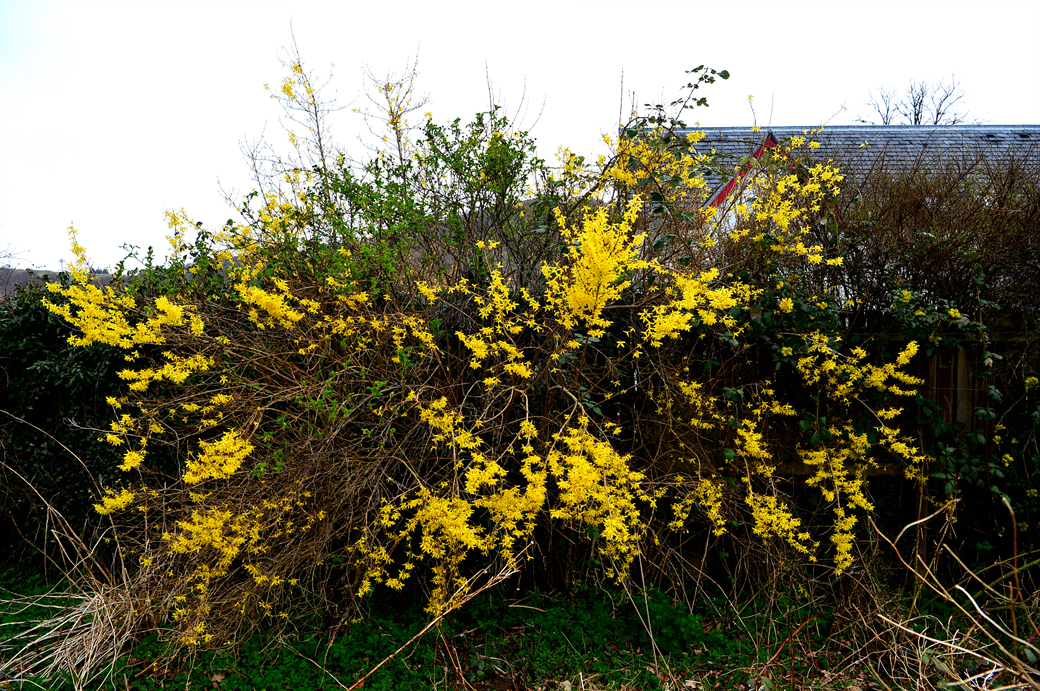 가까이 다가가보니 도로변에 흔하게 피어 있던 가시나무 노란 꽃이 아니라, 개나리였다.