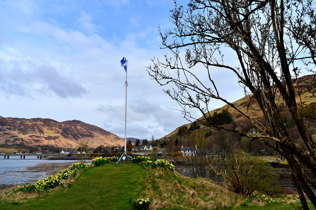 Eilean Donan Castle이 있는 작은 섬 한쪽에는 스코틀랜드기가 게양되어 있다.