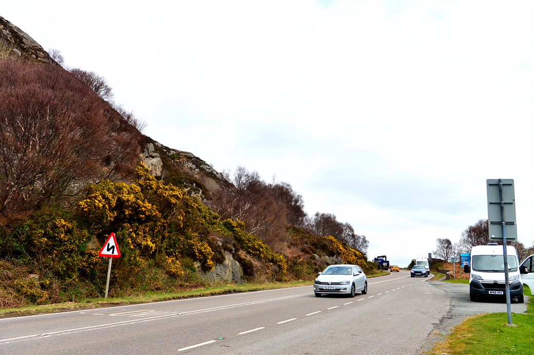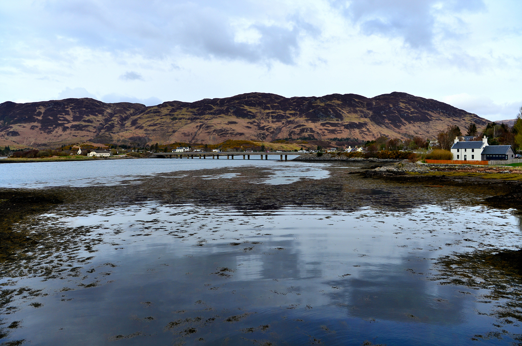 멀리 바다를 가로지르는 긴 다리가 보이는데, 스카이섬의 관문인 Skye Bridge다.