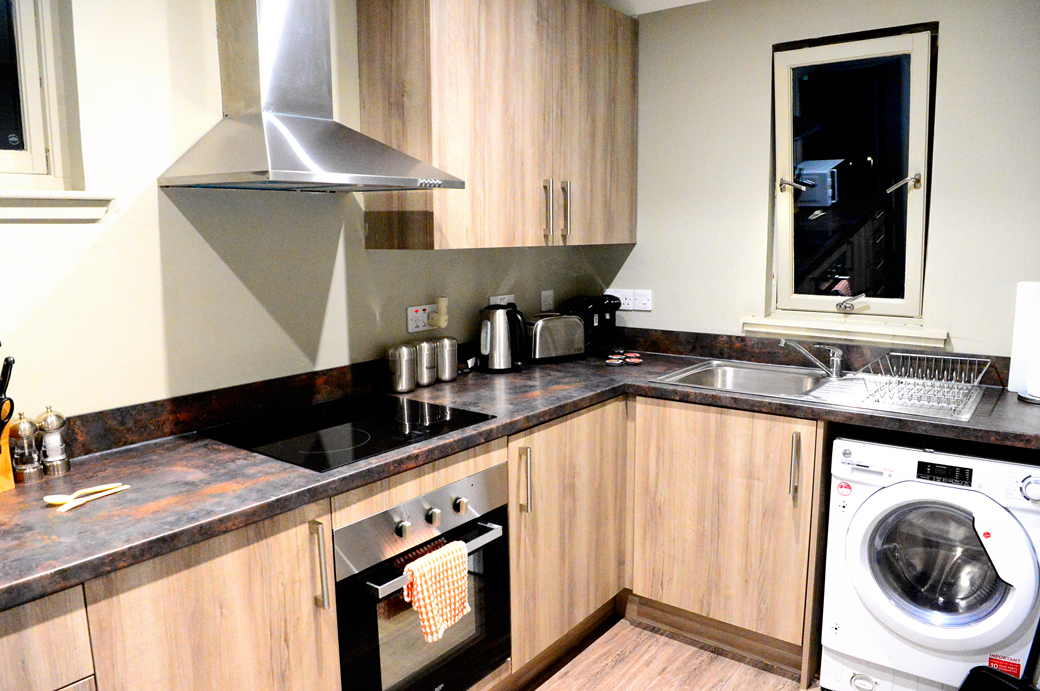 주방 모습인데, 기본 싱크대는 물론이고 레인지, 오븐, 커피 포트, 토스터 등 기본적인 것 외에 세탁기, 냉장고까지