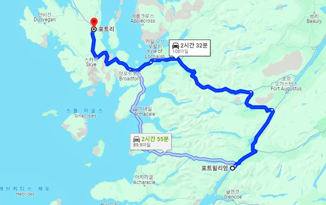 포트 윌리엄에서 스카이섬으로 이어지는 길은 딱 두 갈래인데, 조금 짧은 거리의 아래쪽 노선이 더 많은 시간이