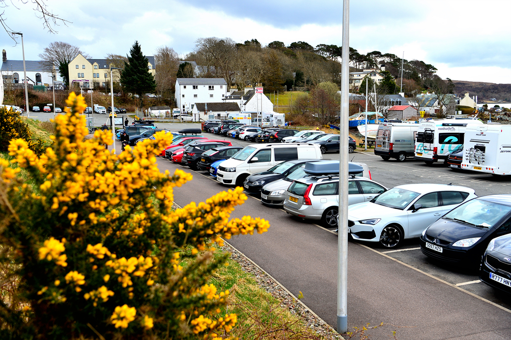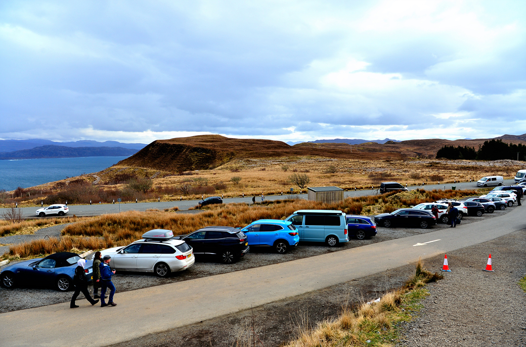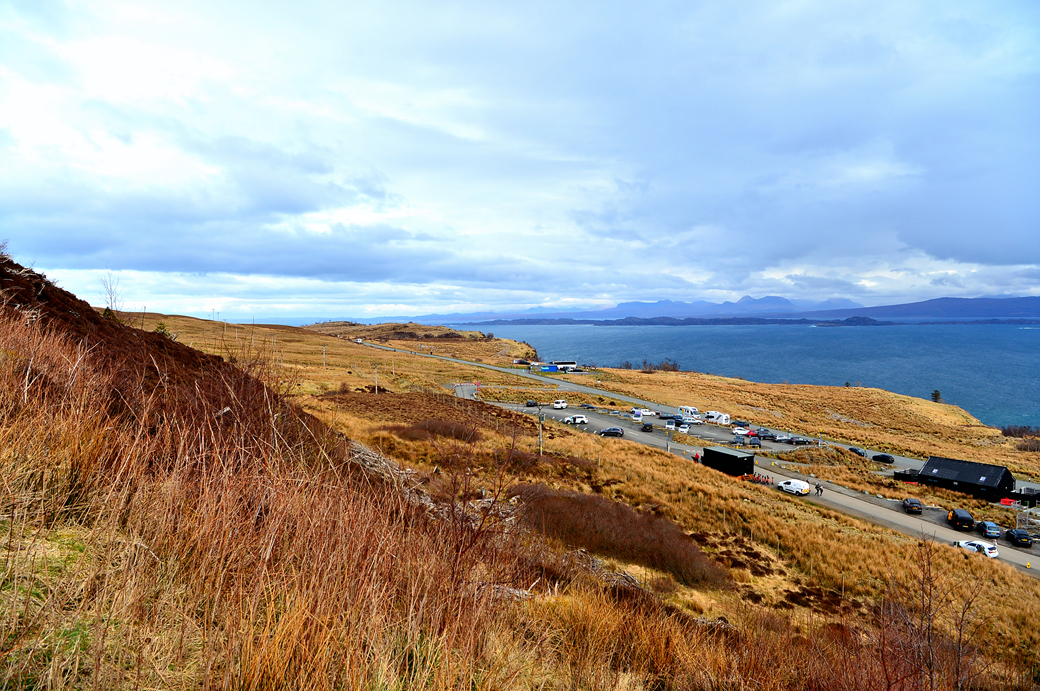 주차장에서 이어지는 해변을 끼고 달리는 도로와 그 너머로 펼쳐진 스카이섬에 딸린 섬과 바다 풍경이다.