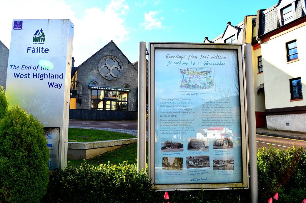 서부 하일랜드의 종착점이라는 표지판과 함께 포트 윌리엄에 대한 안내판이 세워져 있다.