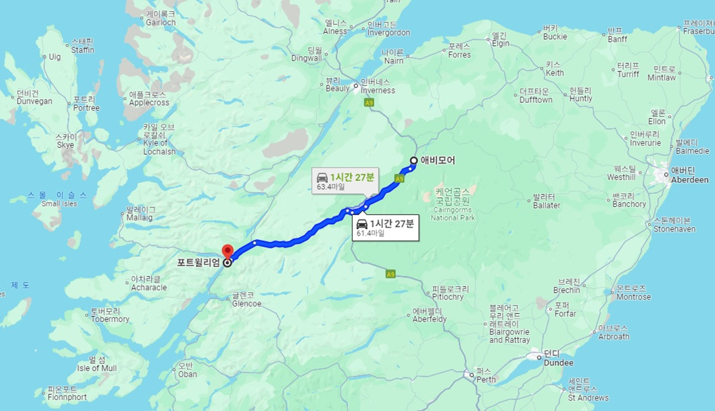 지금 우리가 달리고 있는 길은 케언곰스 국립공원의 좌측에 위치하고 있는 셈인데, 케언곰스 국립공원 Cairngorms