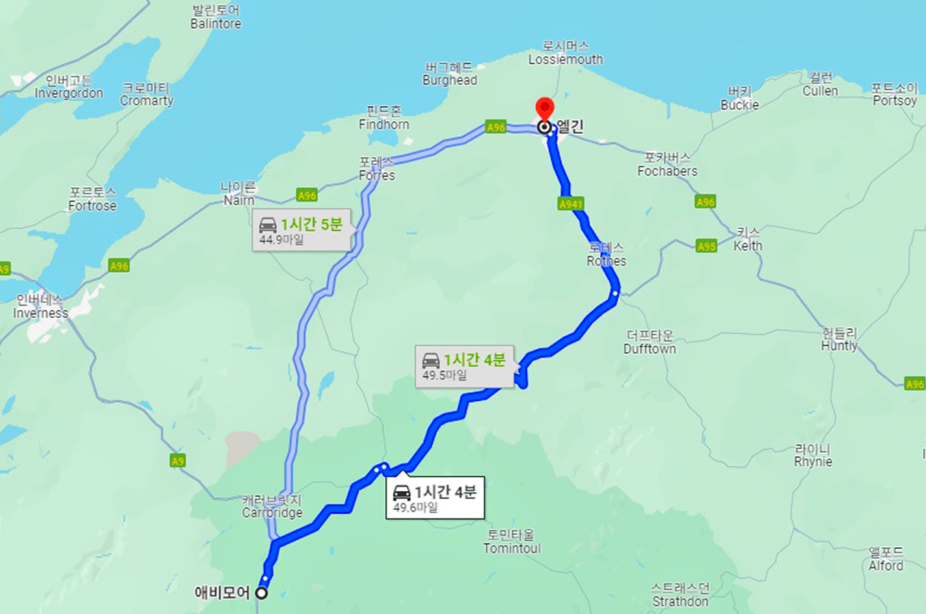 애비모어에서 엘긴으로 오는 동안의 우리 여정이다.
