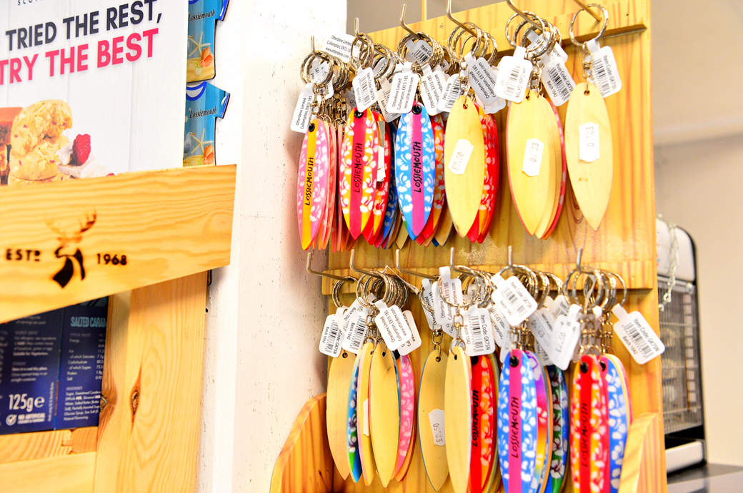 서핑 보드 모양의 열쇠고리도 판매하는데, 이곳 지명 Lossiemouth가 적혀 있다.
