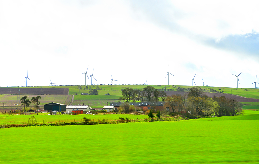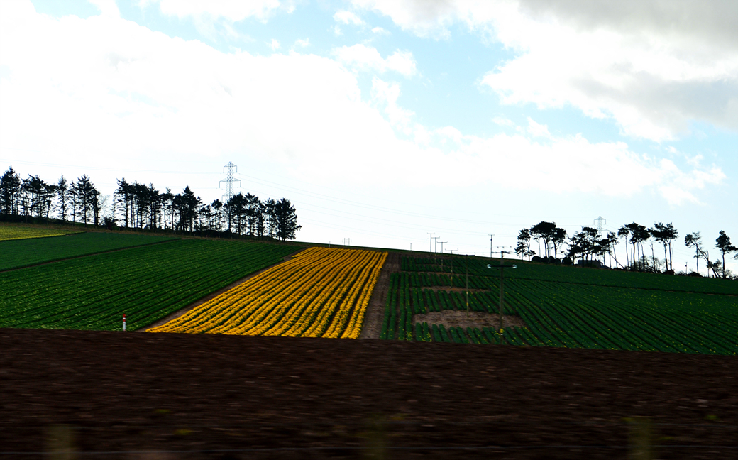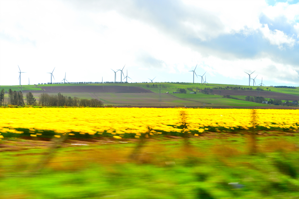 언덕 위에는 한 무리의 풍력 발전기가 펼쳐져 있고, 그 아래 화사하게 이어진 노란 꽃밭도 눈에 들어온다.
