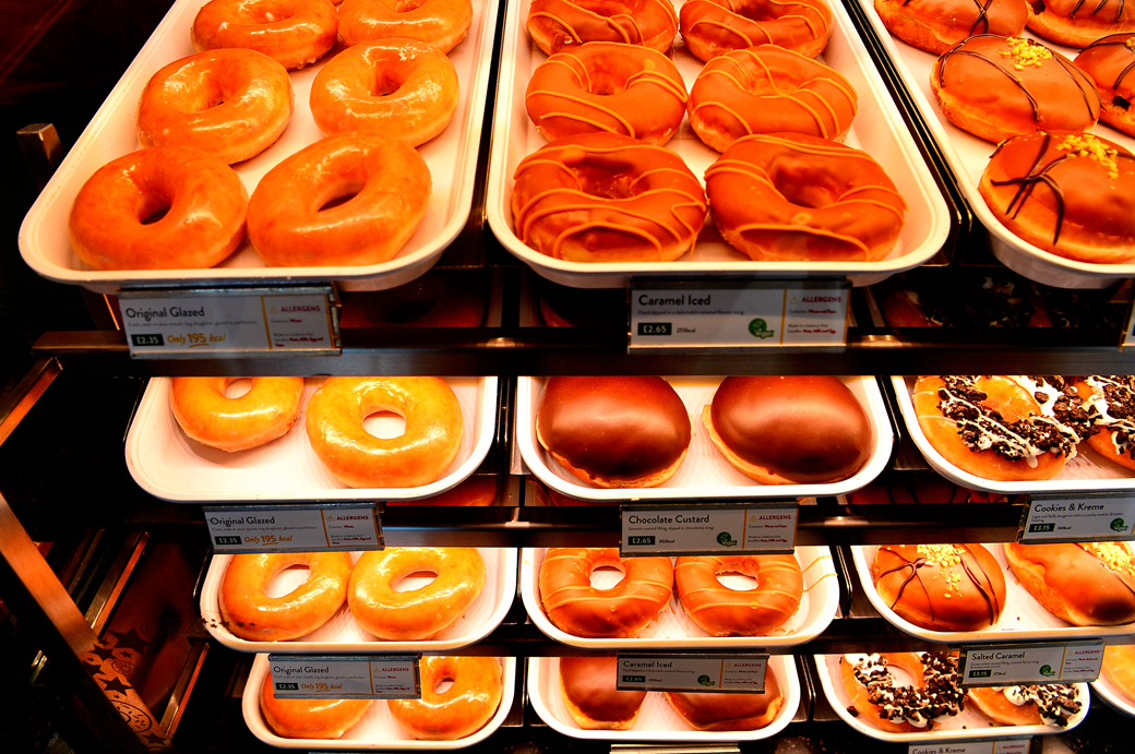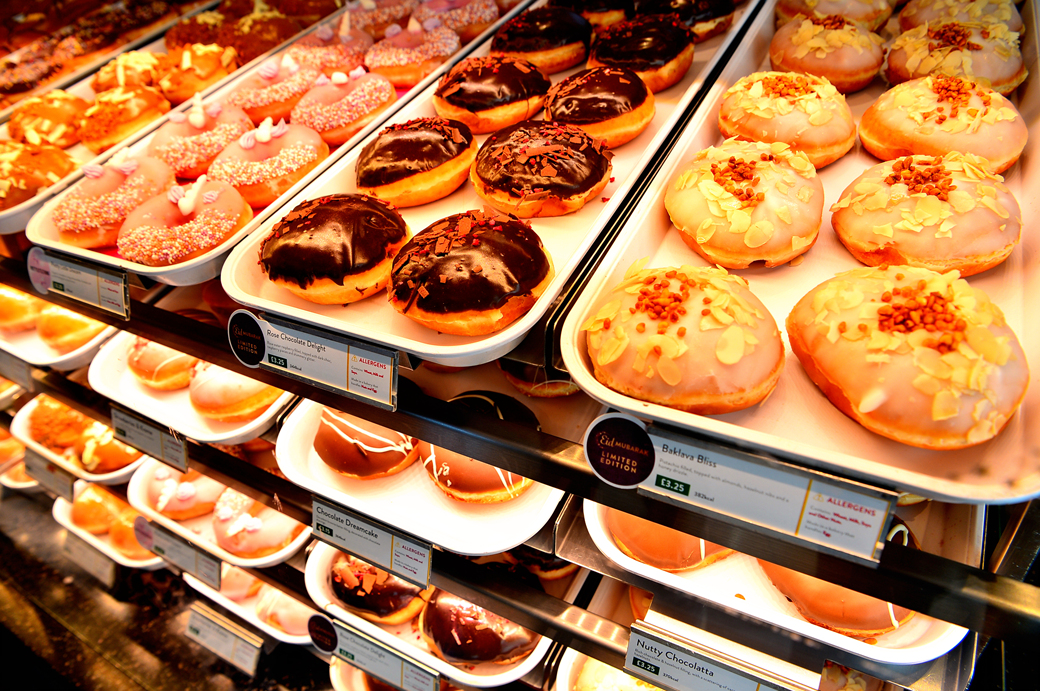 먹음직스러운 도넛이 매대를 가득 채우고 있다.