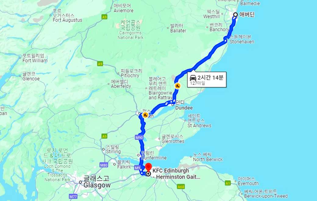 2시간 넘게 달려온 에든버러 외곽이다.
