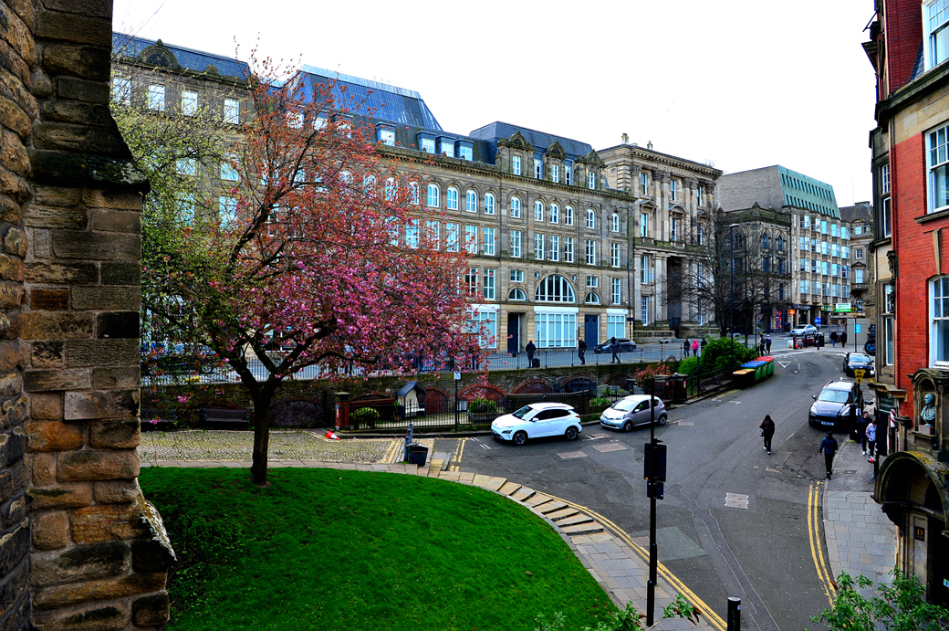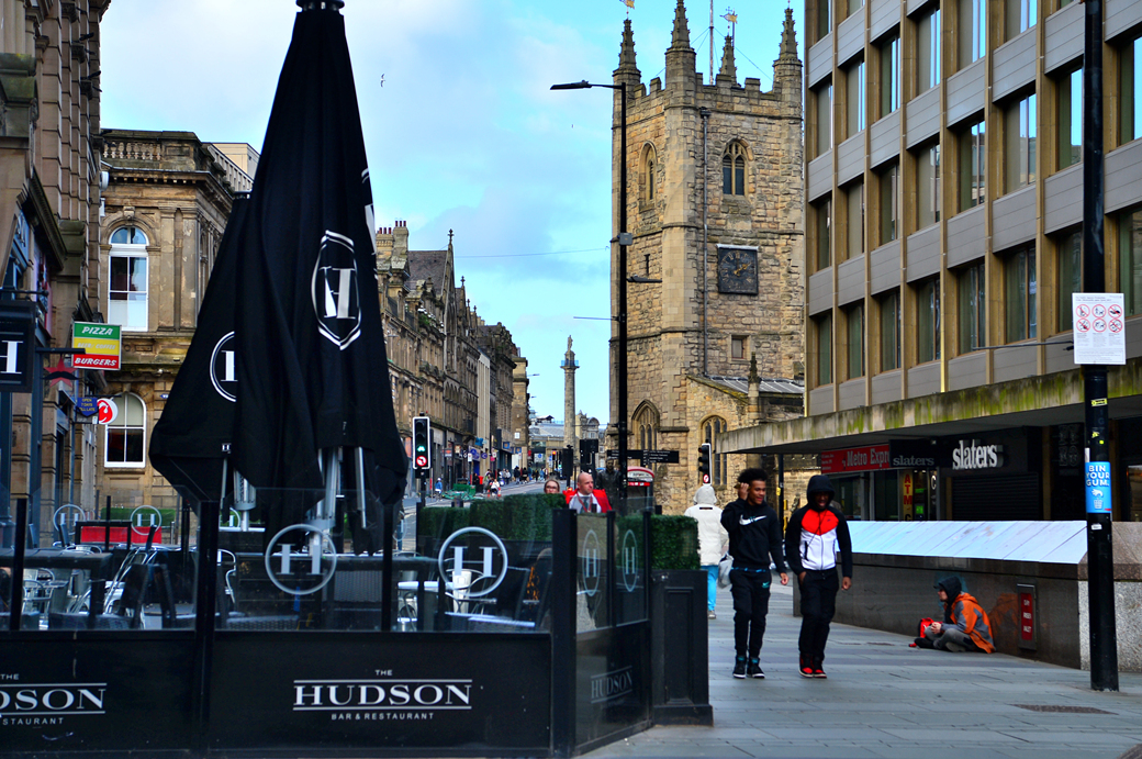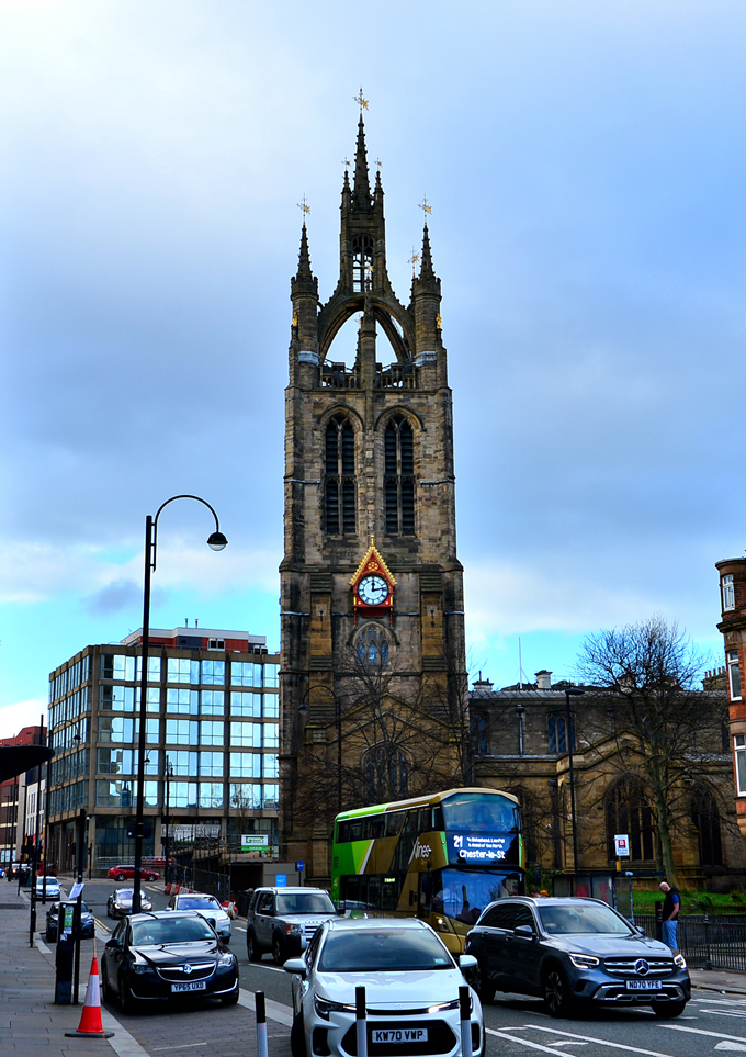 이 거리의 도로변에 우뚝 세워진 교회 첨탑이 보이는데, 뉴캐슬 대성당 Newcastle Catheral이다.