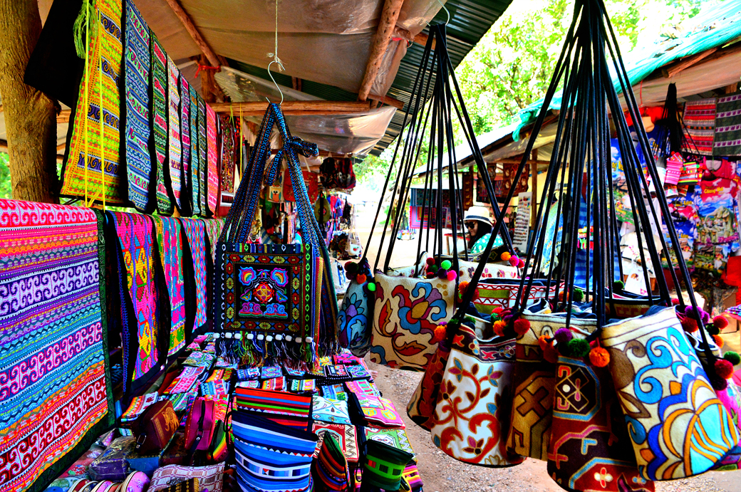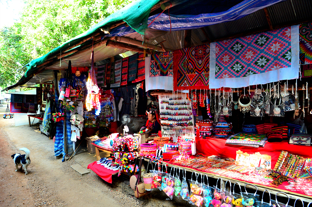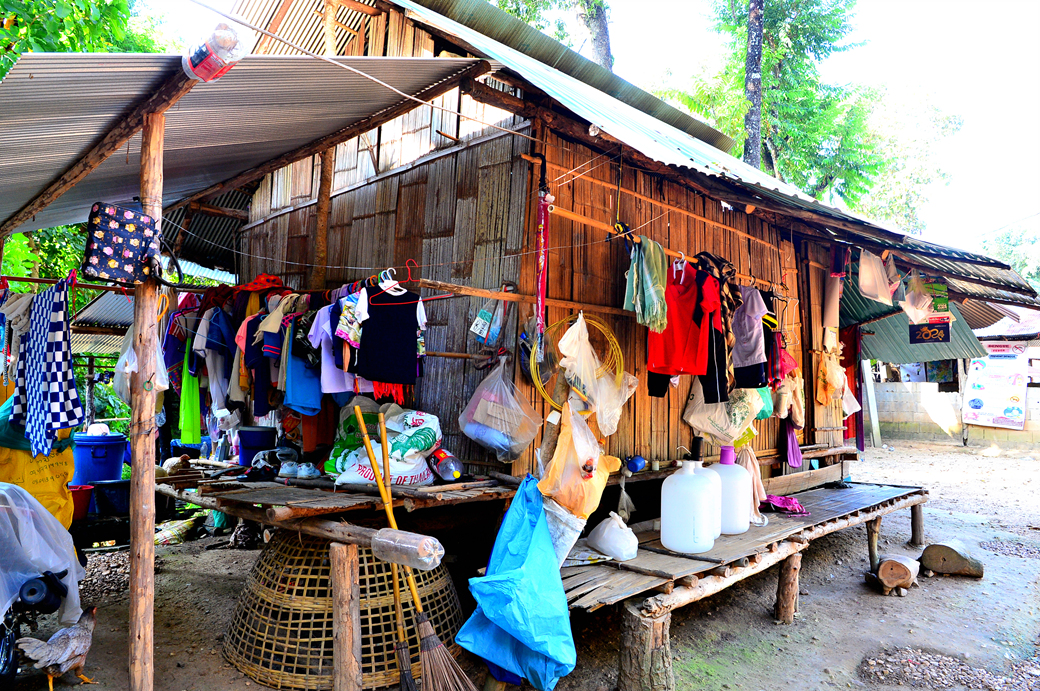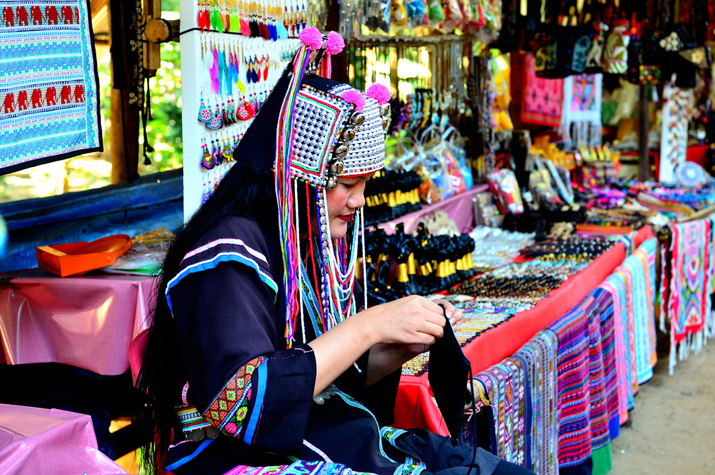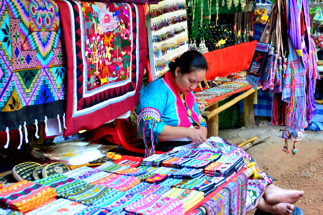 상점을 지키고 앉아 있는 카렌족 여인의 의상이 무척 화려하다.