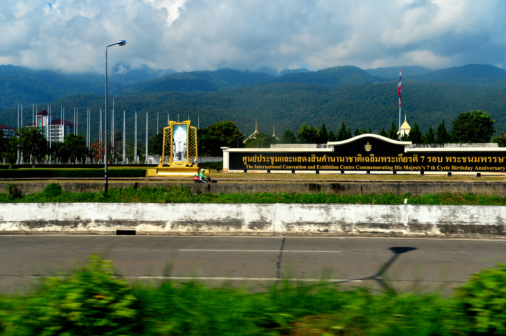 차창을 스치는 치앙마이 교외의 넓고 한적한 곳에 자리한 이 건물은 컨벤션 센터 Chiang Mai International Exhibition