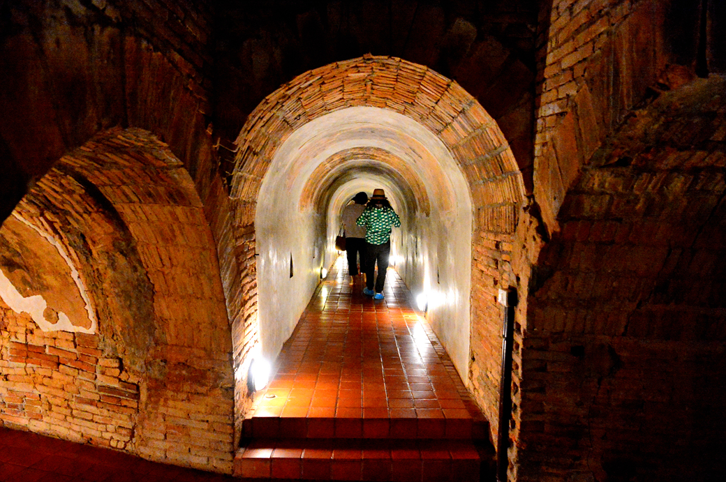 터널을 나와 계단을 오르면 동굴의 꼭대기에 오르게 되는데, 그곳에서는 거대한 제다와 불상이 왓 우몽을 내려다