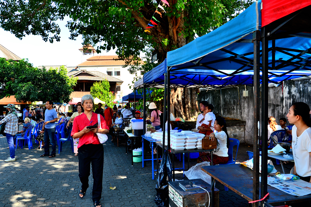 실제로 선데이 마켓이 서는 일요일에 사원 안뜰은 거대한 푸드코트로 변신해 있었고, 황금빛 체디 아래에서 자유롭게