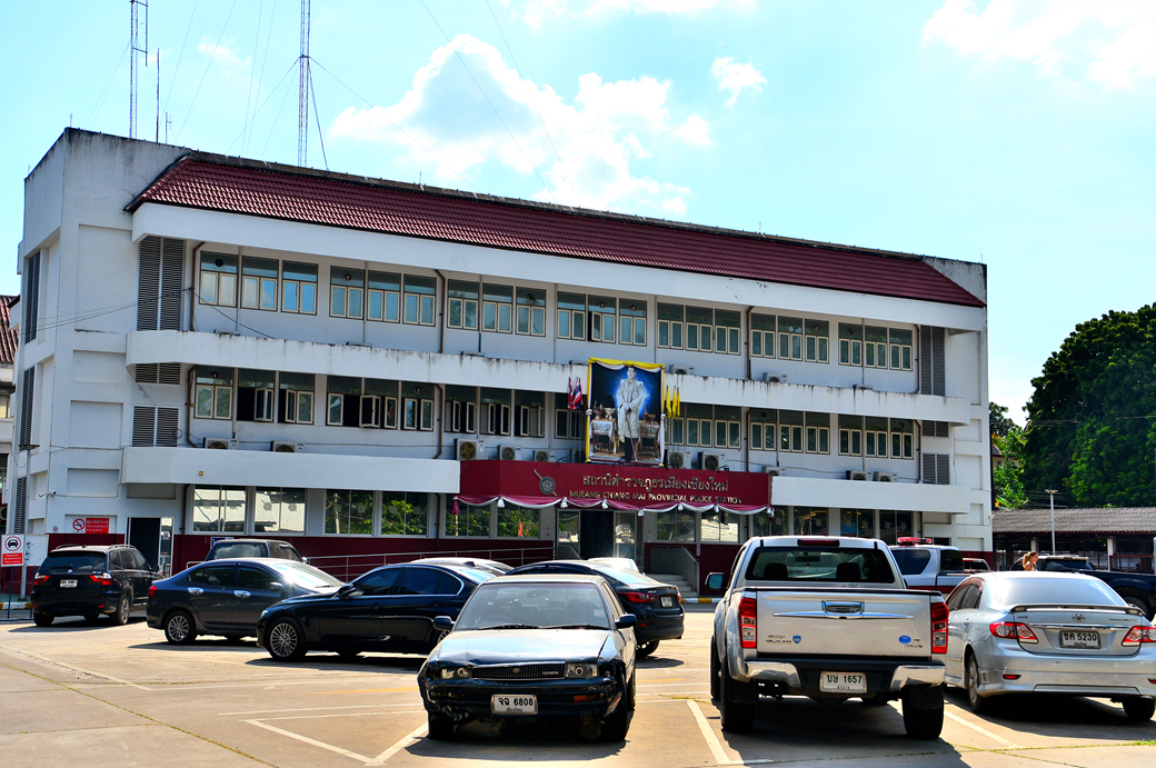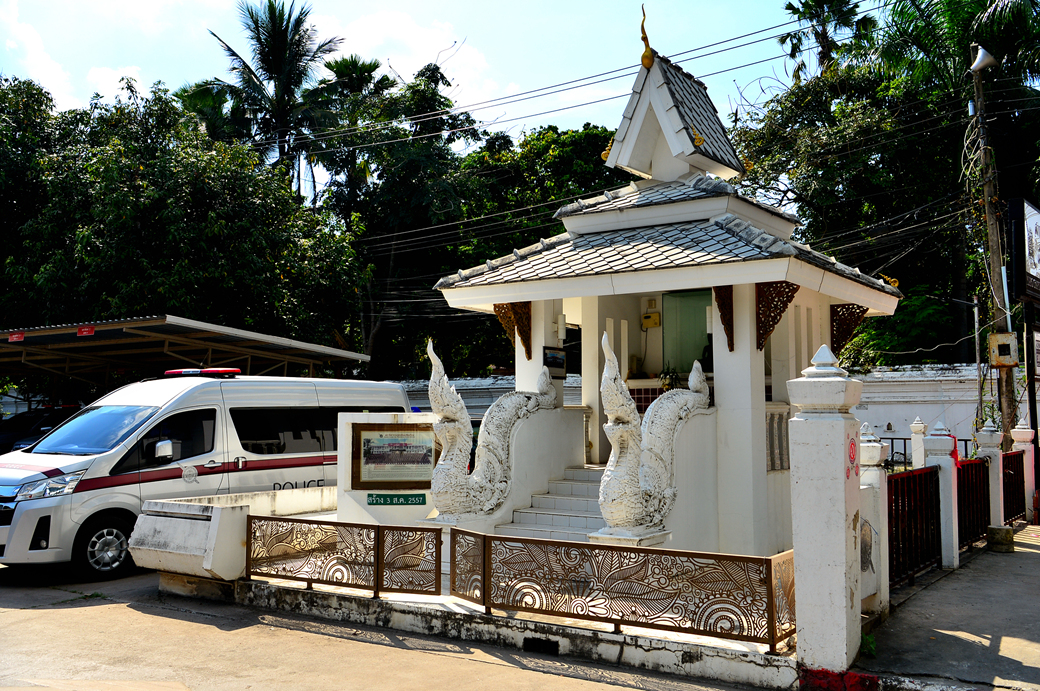 거대한 나무 기둥에 란나 형식의 지붕을 얹은 경찰서 정문 모습이 무척 특이하다.
