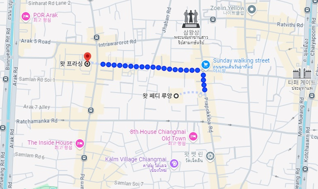 왓 체디 루앙을 나서서 우리가 걸어온 경로다.