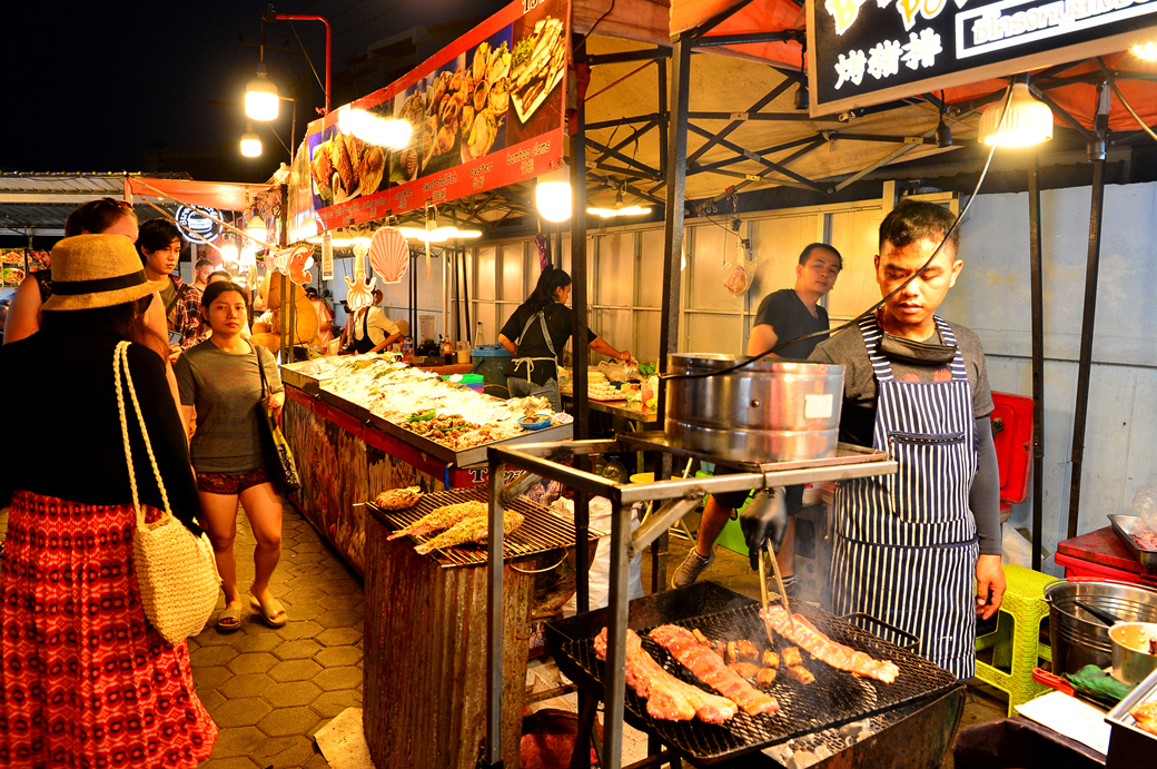 성 밖의 해자와 도로 사이의 빈 공간에도 야시장이 서 있다.