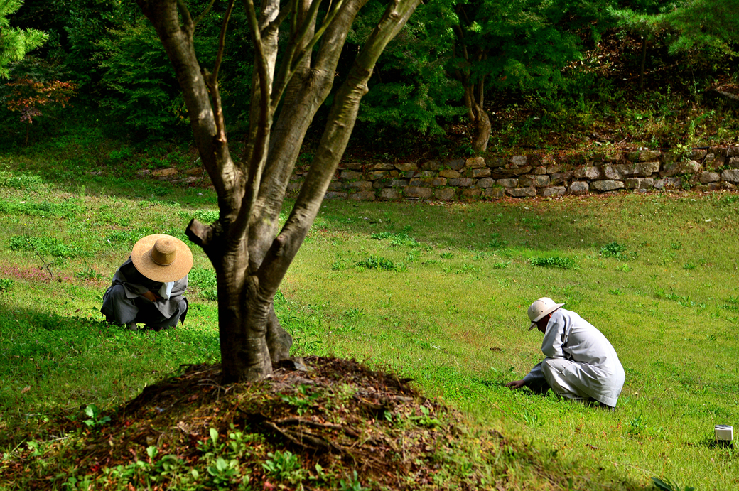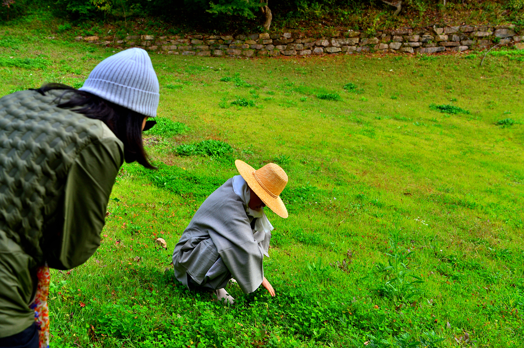 두 스님이 풀밭에서 뭔가를 열심히 찾고 계신다.