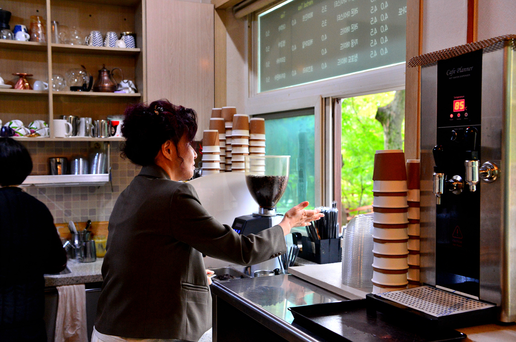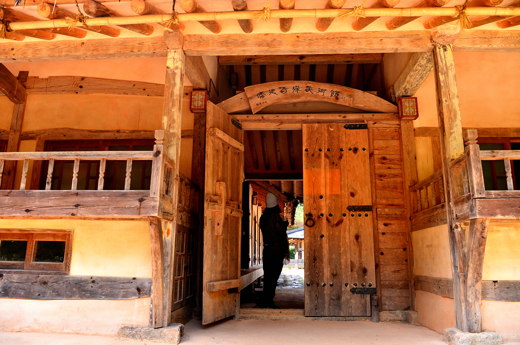 목구조로 아름답게 장식된 건물 안으로 들어선다.
