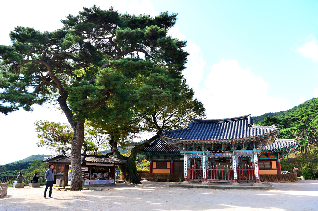 대웅전 오른쪽의 종각과 거대한 소나무가 운치 있는 풍경을 자아내고 있다.