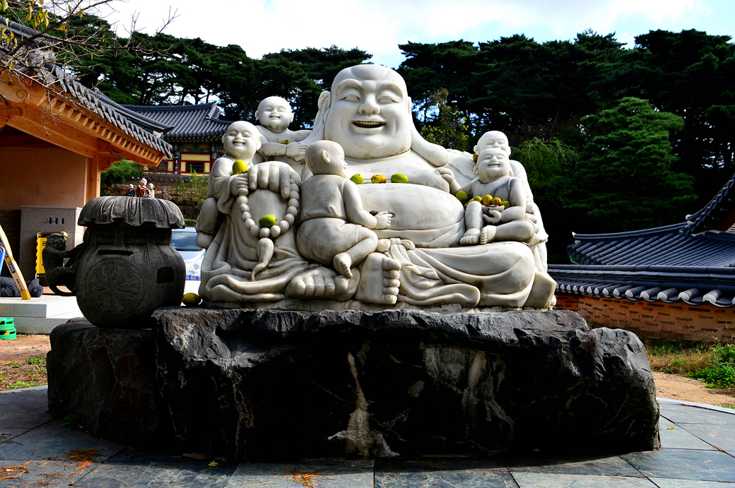 탑과 마주 하고 있는 포대화상 위에도 나무에서 떨어진 모과들이 놓여 있다.