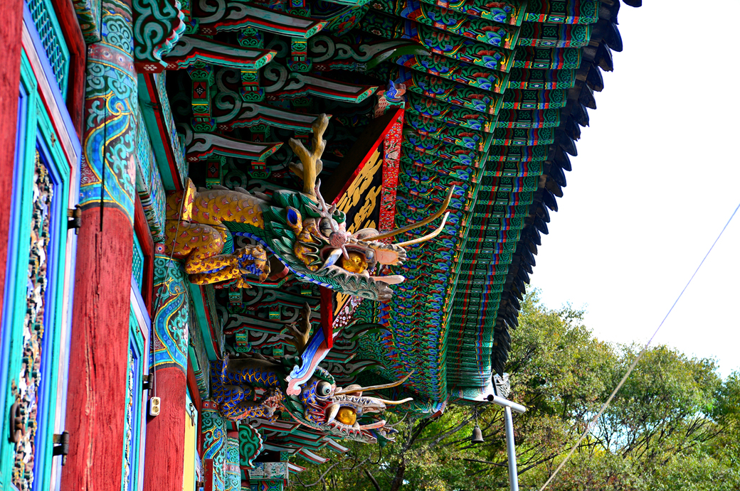 원통보전 기둥 위에는 무척 섬세하게 조각된 용머리가 장식되어 있다.