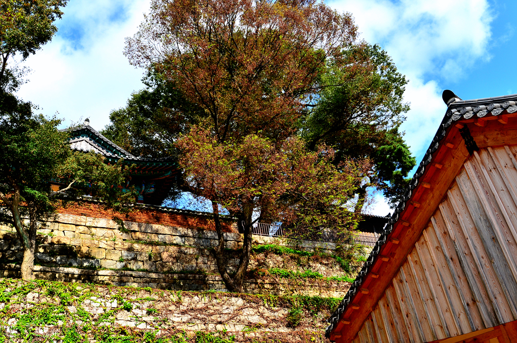 담장 아래의 활엽수도 단풍으로 물들기 시작하고 있다.