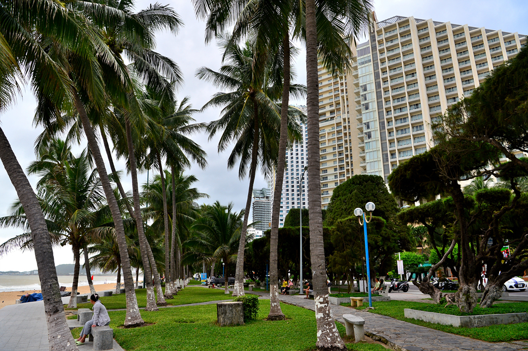 낮고 짙게 드리워진 구름 아래로 나트랑의 드넓은 해변이 펼쳐져 있다.