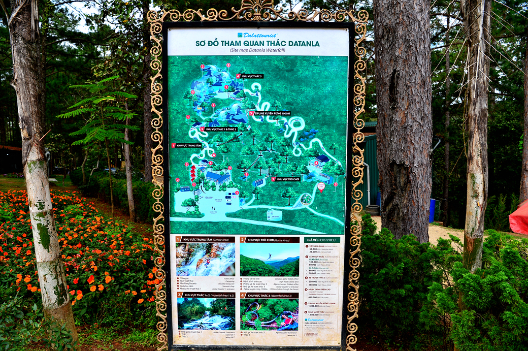 넓게 분포되어 있는 다딴라 폭포의 시설물들을 보여주는 안내판이다.