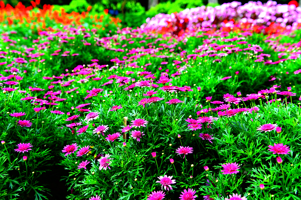 정원의 잘 가꾸어진 아름다운 꽃들을 구경한다.