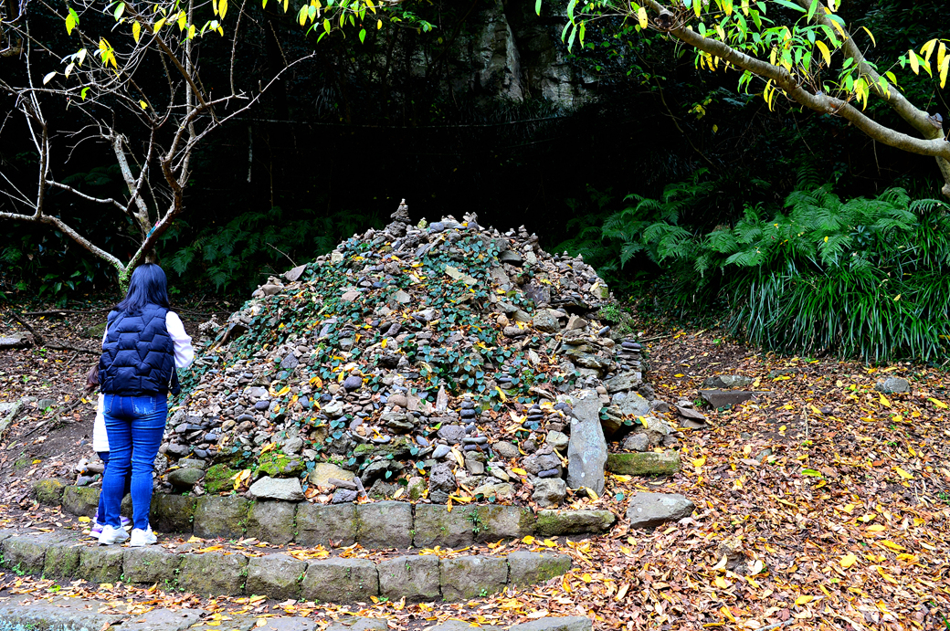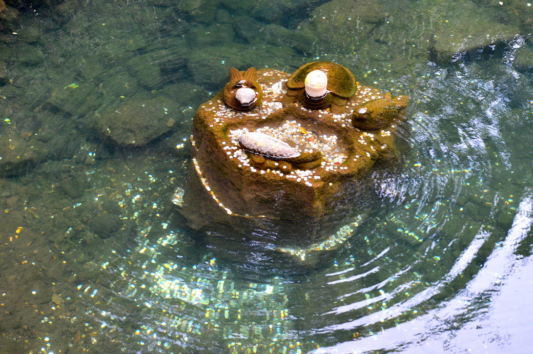 커다란 돌 위에 수많은 동전들이 놓여 있다.