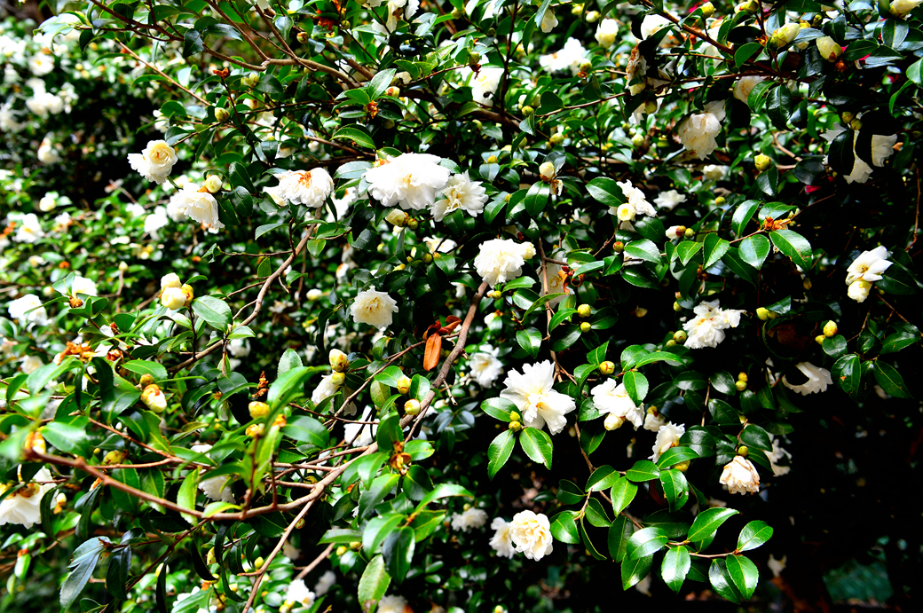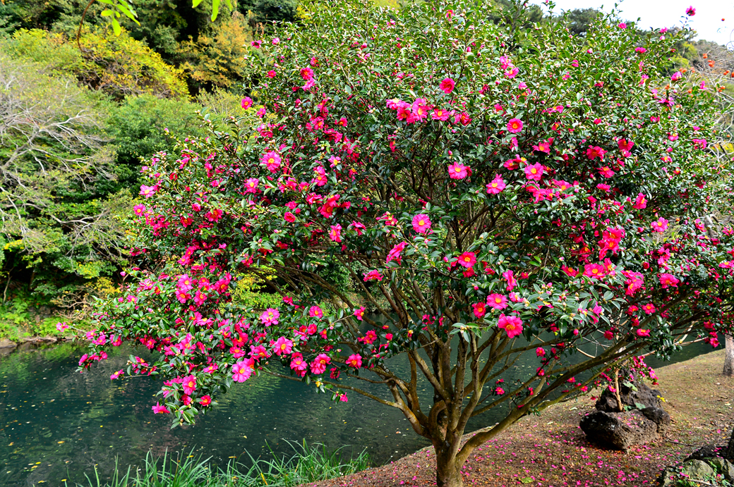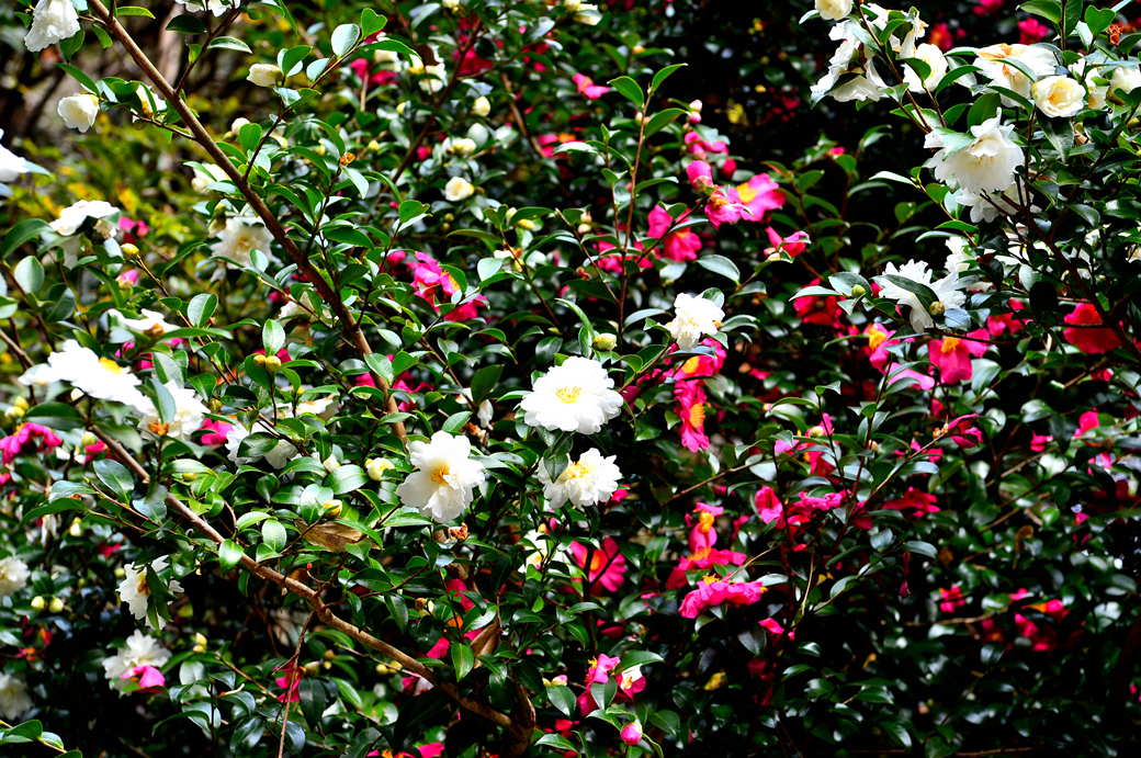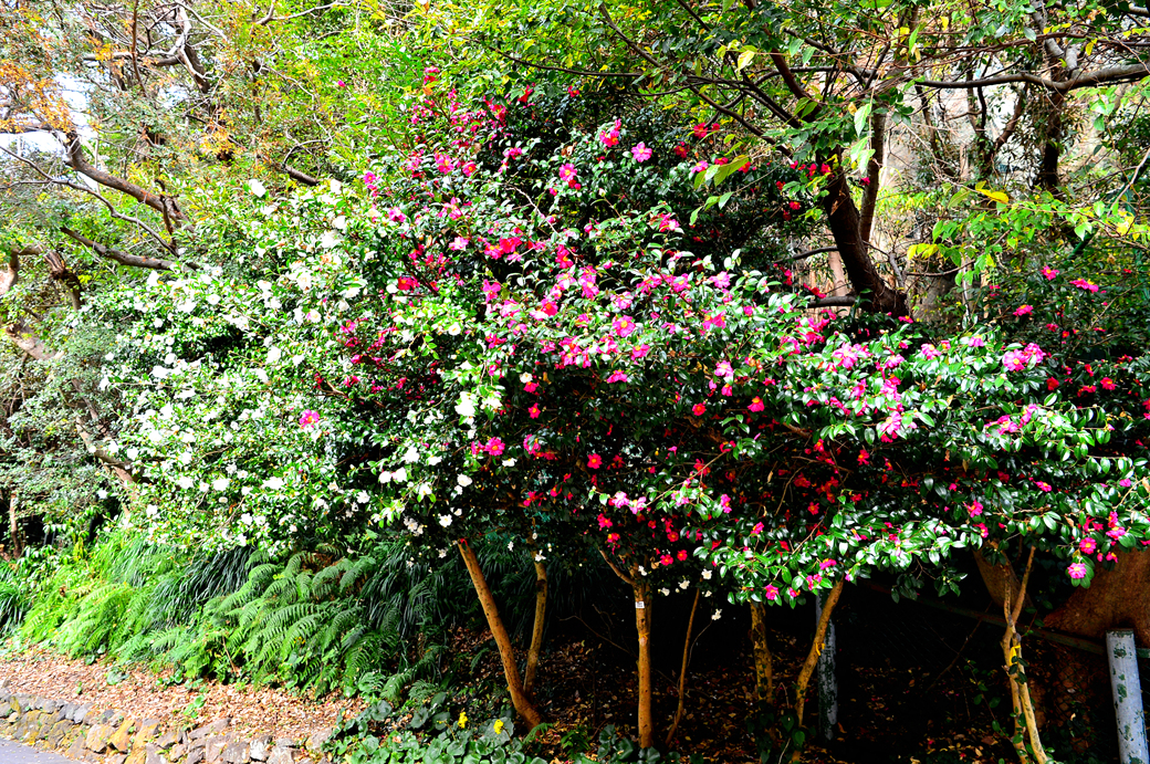 천지연 폭포로 이어지는 산책로 주변의 동백꽃인데, 빨간 동백꽃과 함께 하얀 꽃송이들도 많이 보인다.