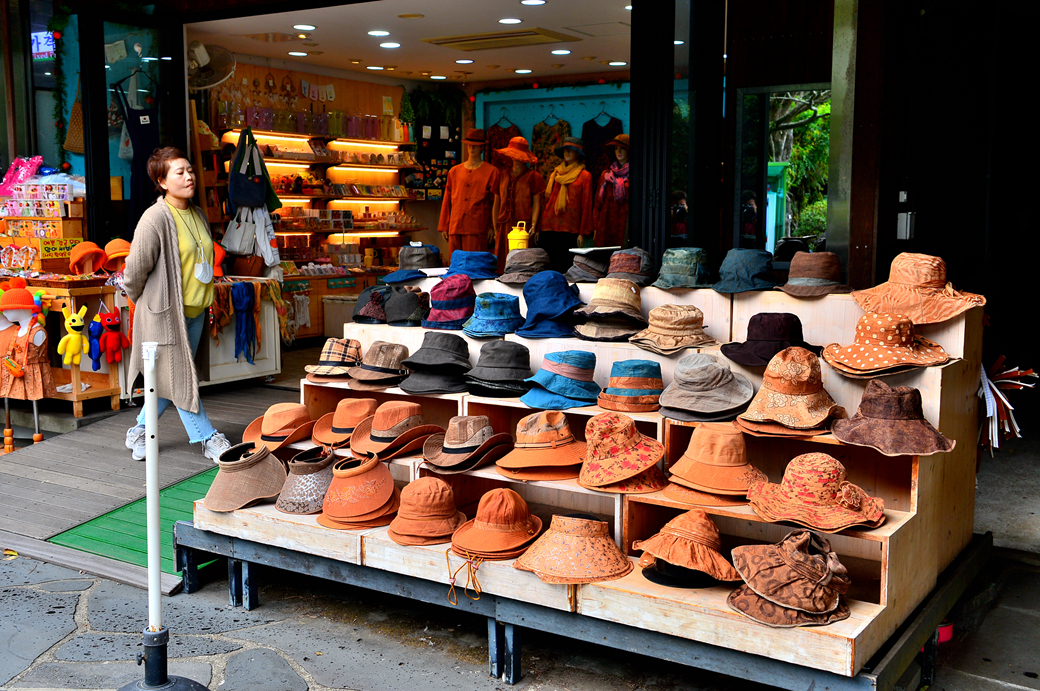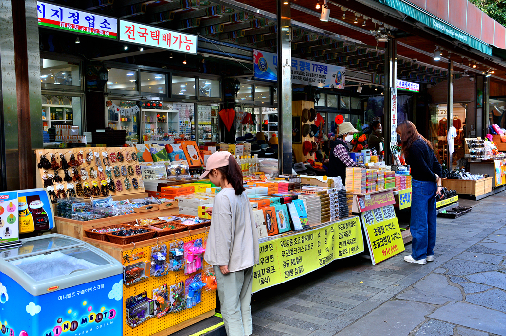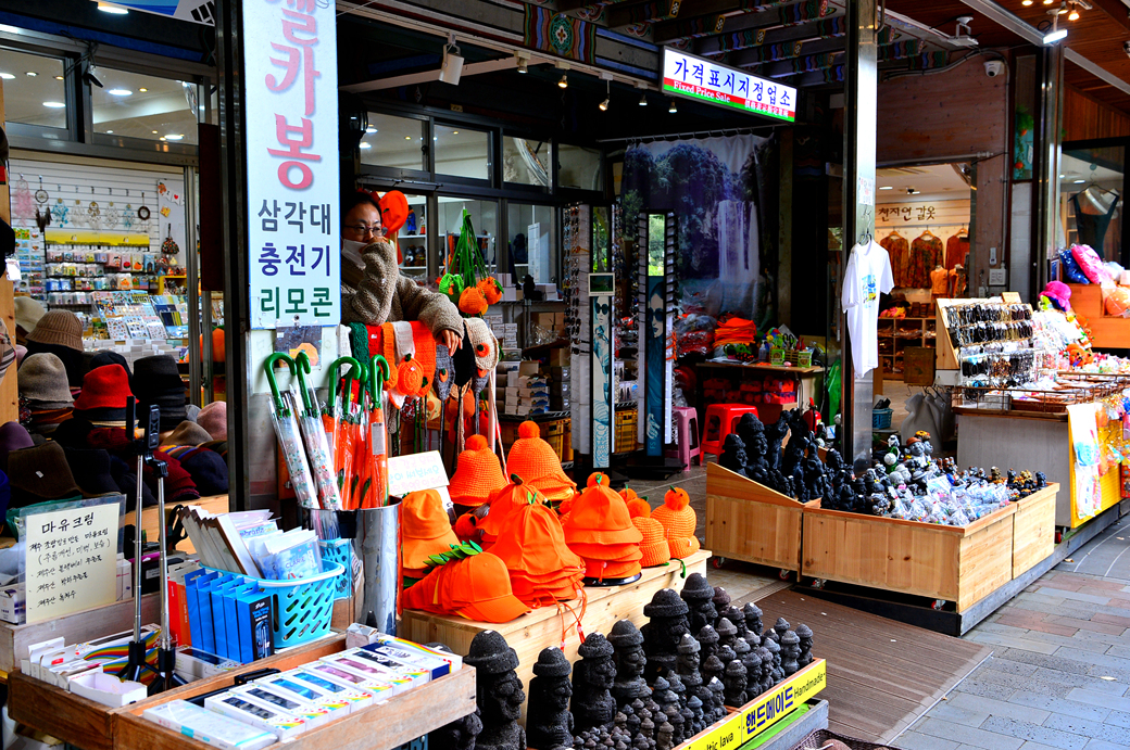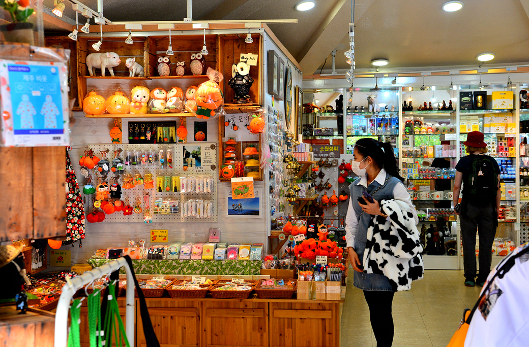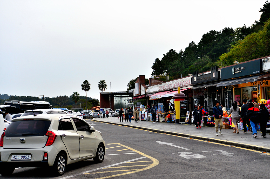 천지연 폭포 입구의 기념품점들 모습이다.