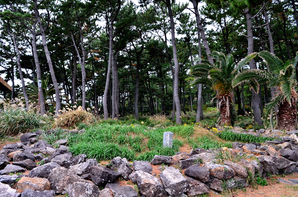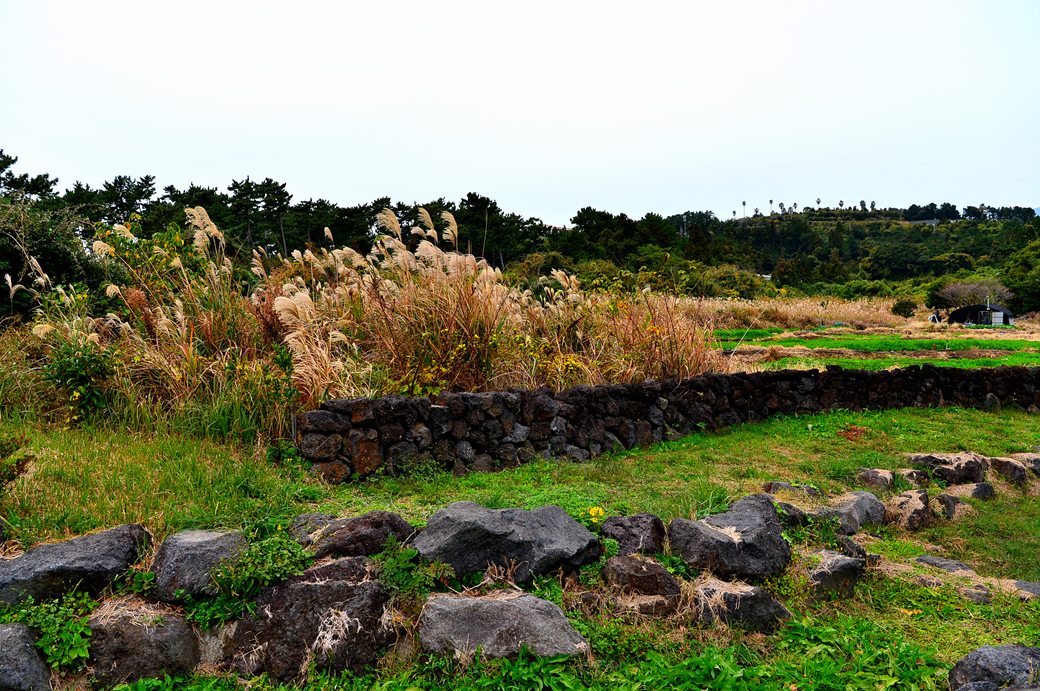 잘 쌓아놓은 돌담 뒤로는 동백숲이 이어져 있다.